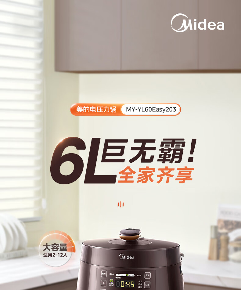 家用电器  > 厨房小电  > 电压力锅  >  美的/MIDEA  >  美的(Midea)品牌官方全自动智能预约电压力锅6L大容量家用双胆煲汤电饭煲60Easy203多功能高压锅4-6人 MY-YL60Easy203/台