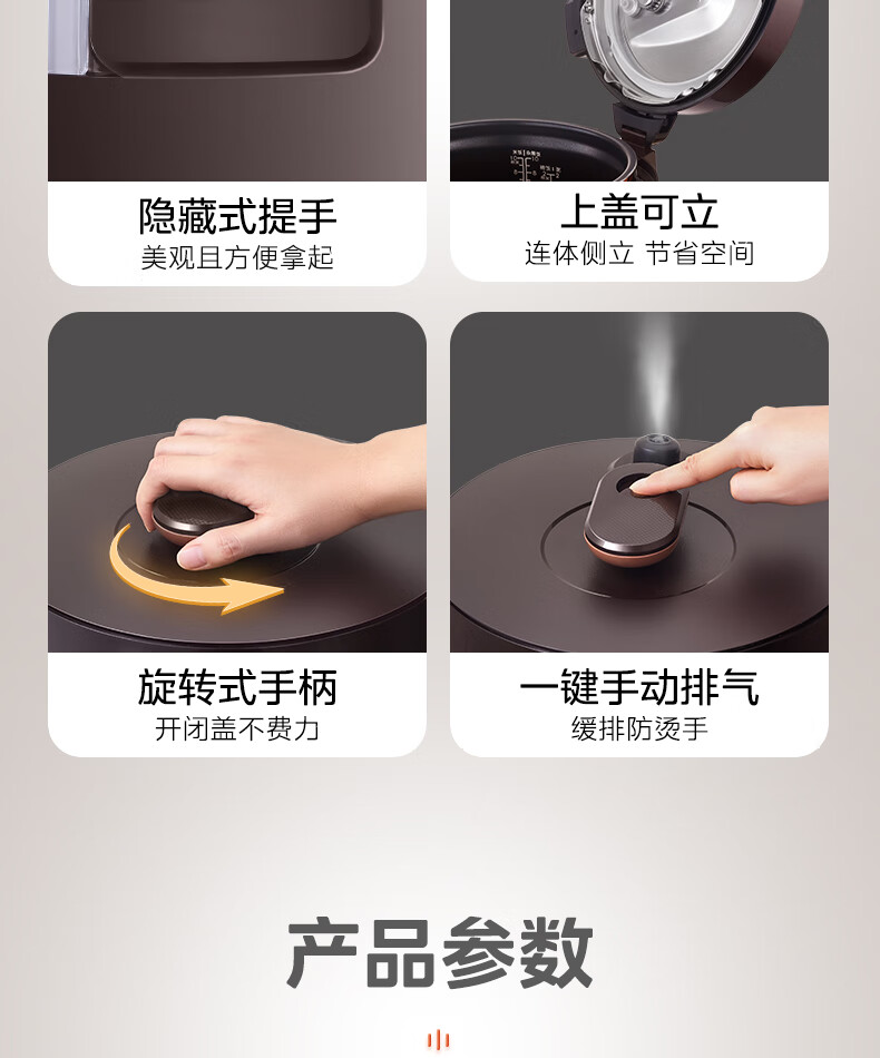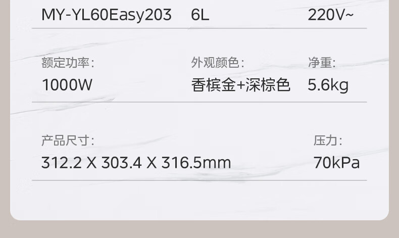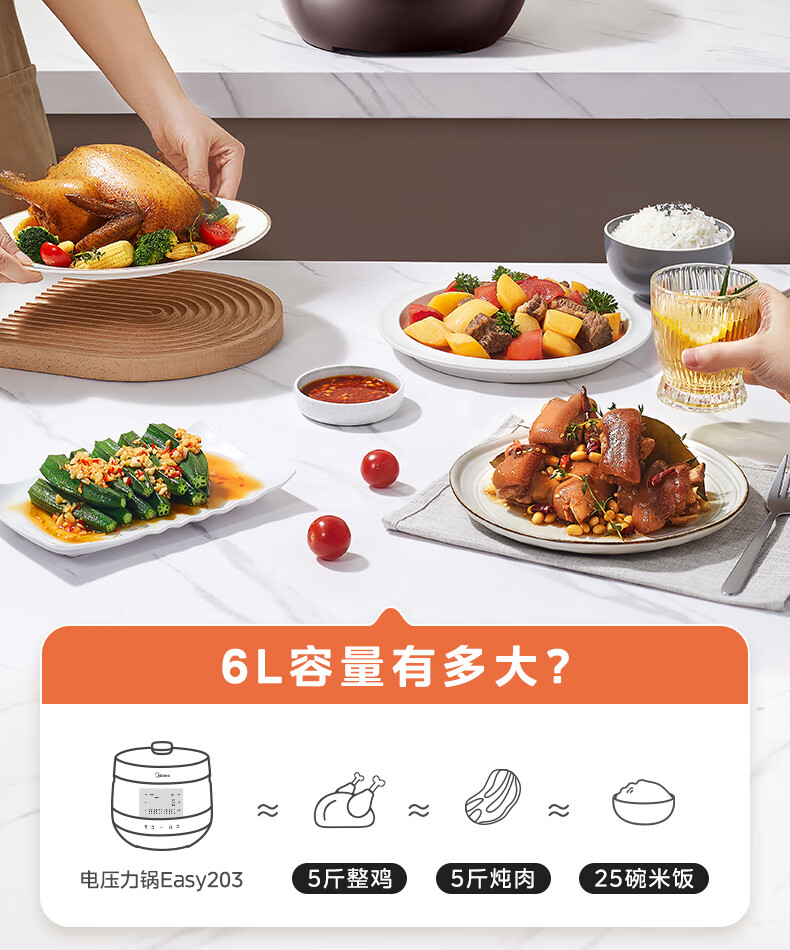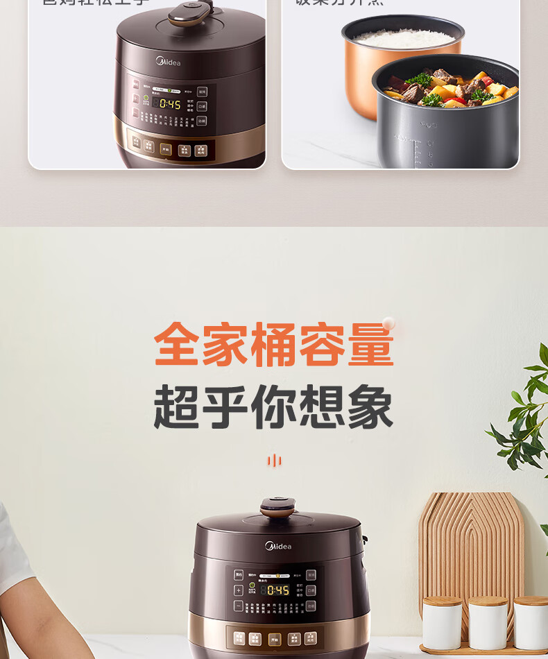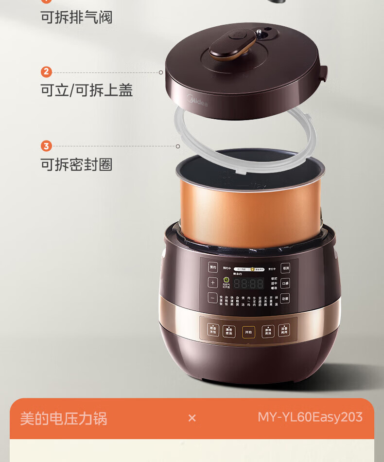 • 商品名称:美的(Midea)品牌官方全自动智能预约电压力锅6L大容量家用双胆煲汤电饭煲60Easy203多功能高压锅4-6人 MY-YL60Easy203/台