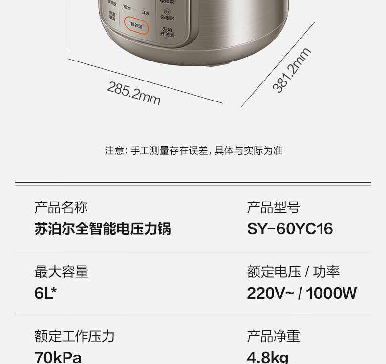 • 商品名称:苏泊尔电压力锅6L全自动智能预约家用煲汤多功能面板易清洁双内胆压力锅电饭煲高压锅4-8人SY-60YC16 SY-60YC16/个