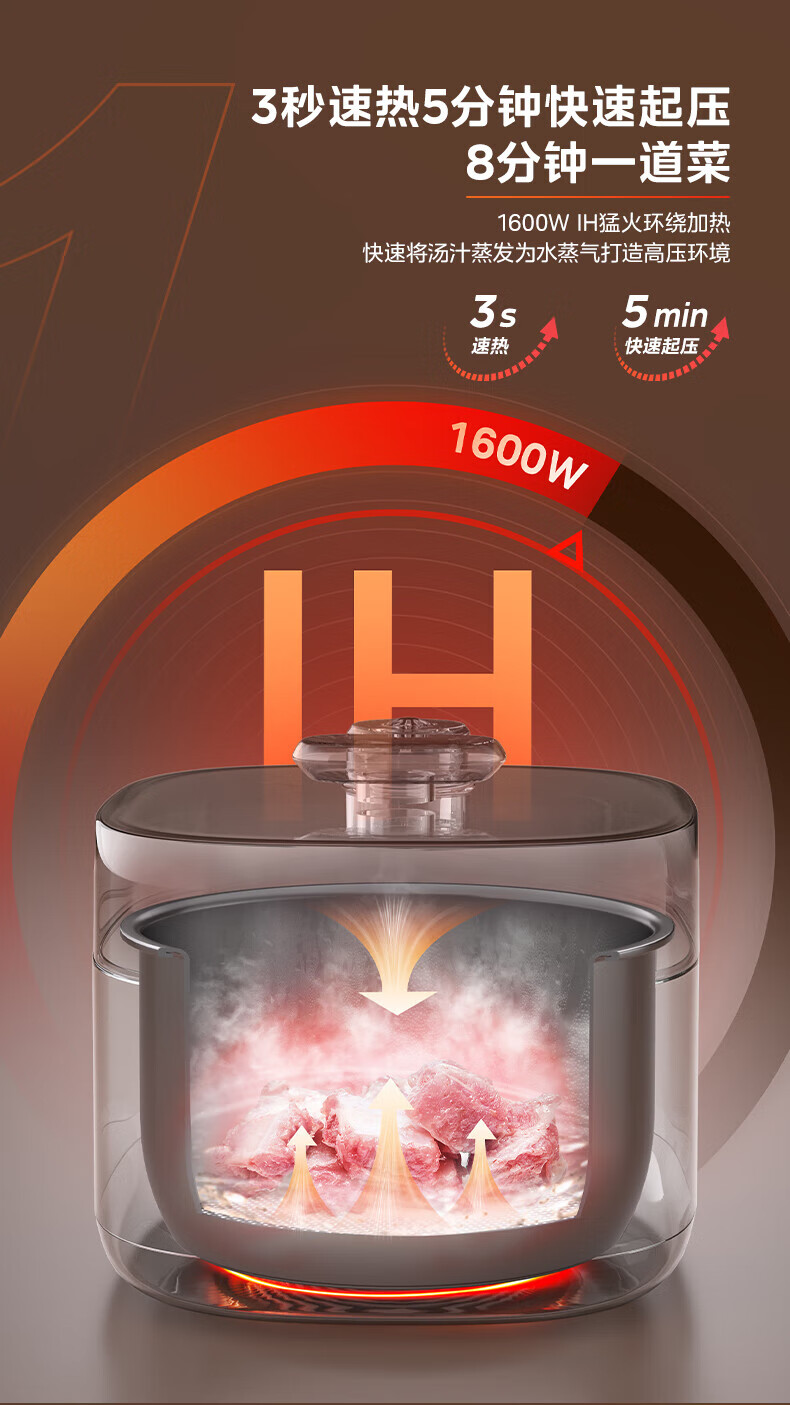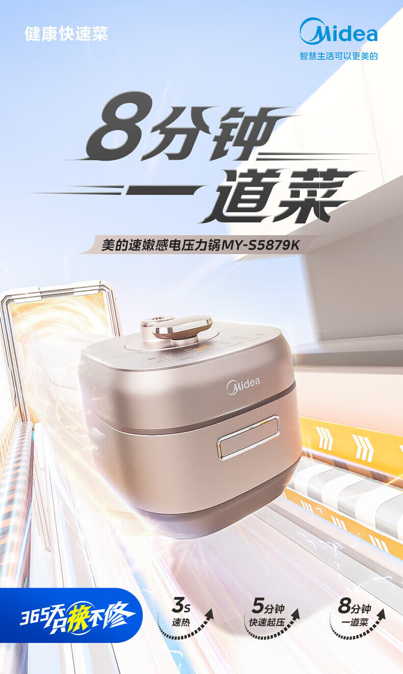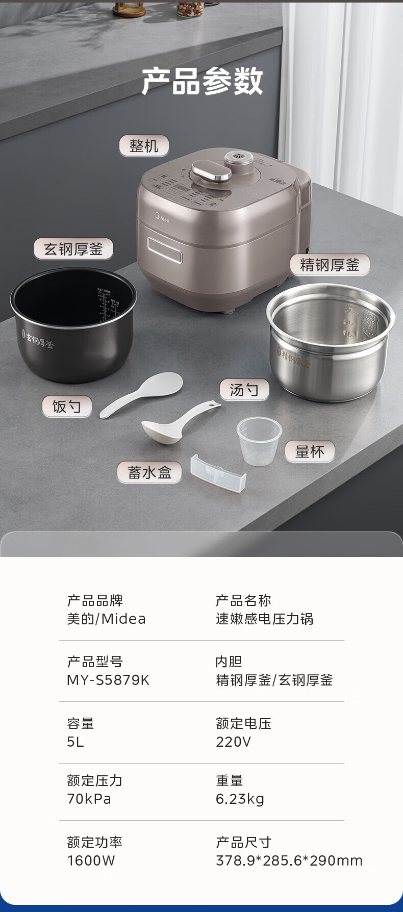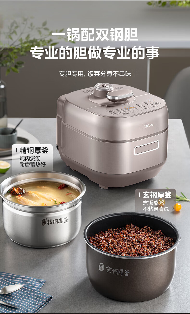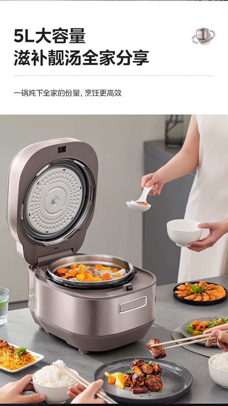 • 商品名称:美的(Midea)电压力锅IH速嫩感 0涂层高压锅5升家用煲汤智能预约电饭煲自动排气健康钢胆 MY-S5879K MY-S5879K/台