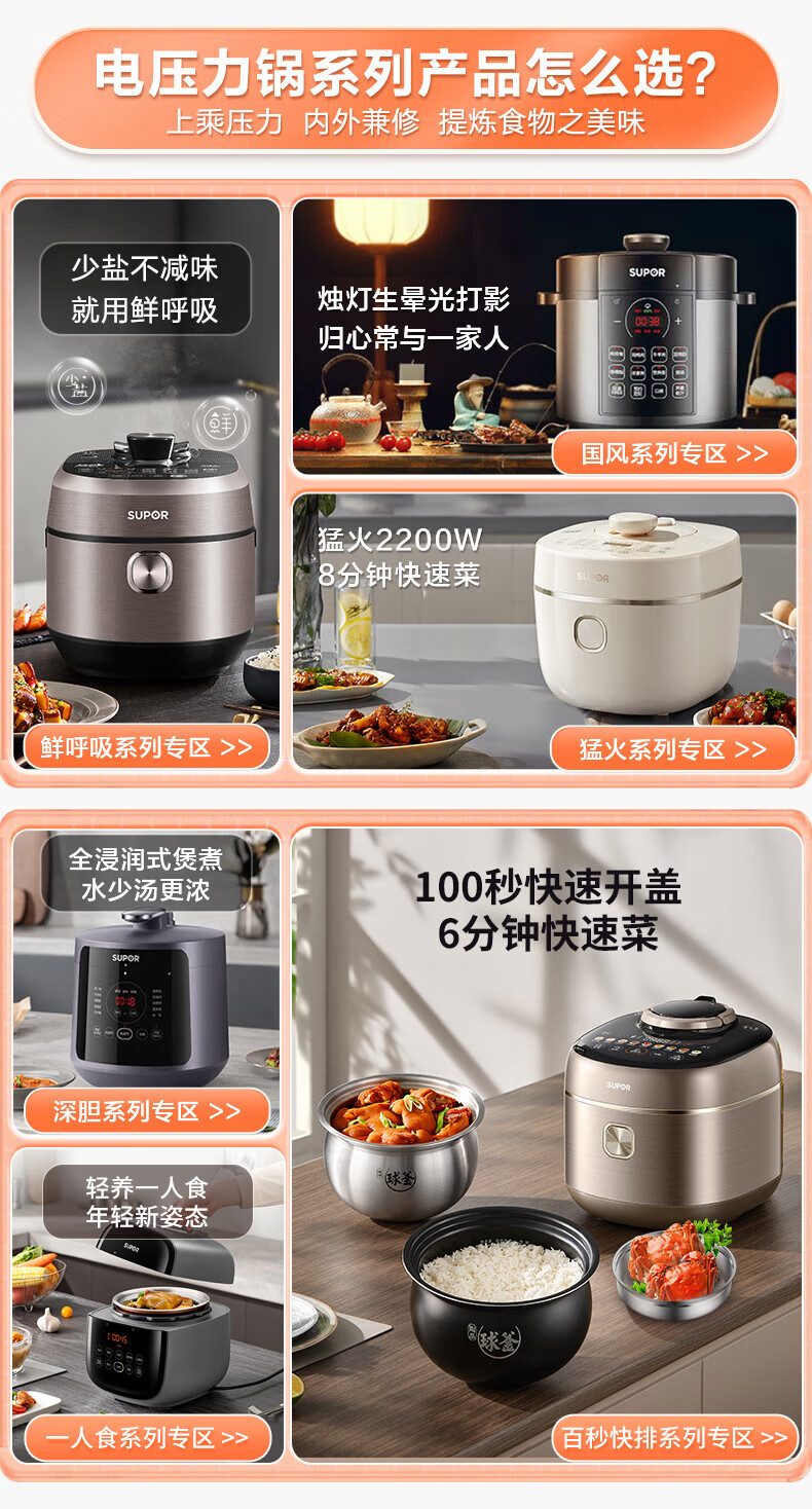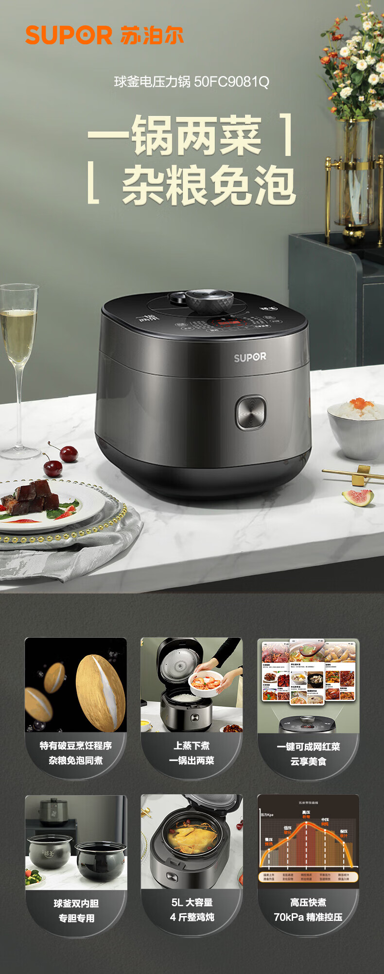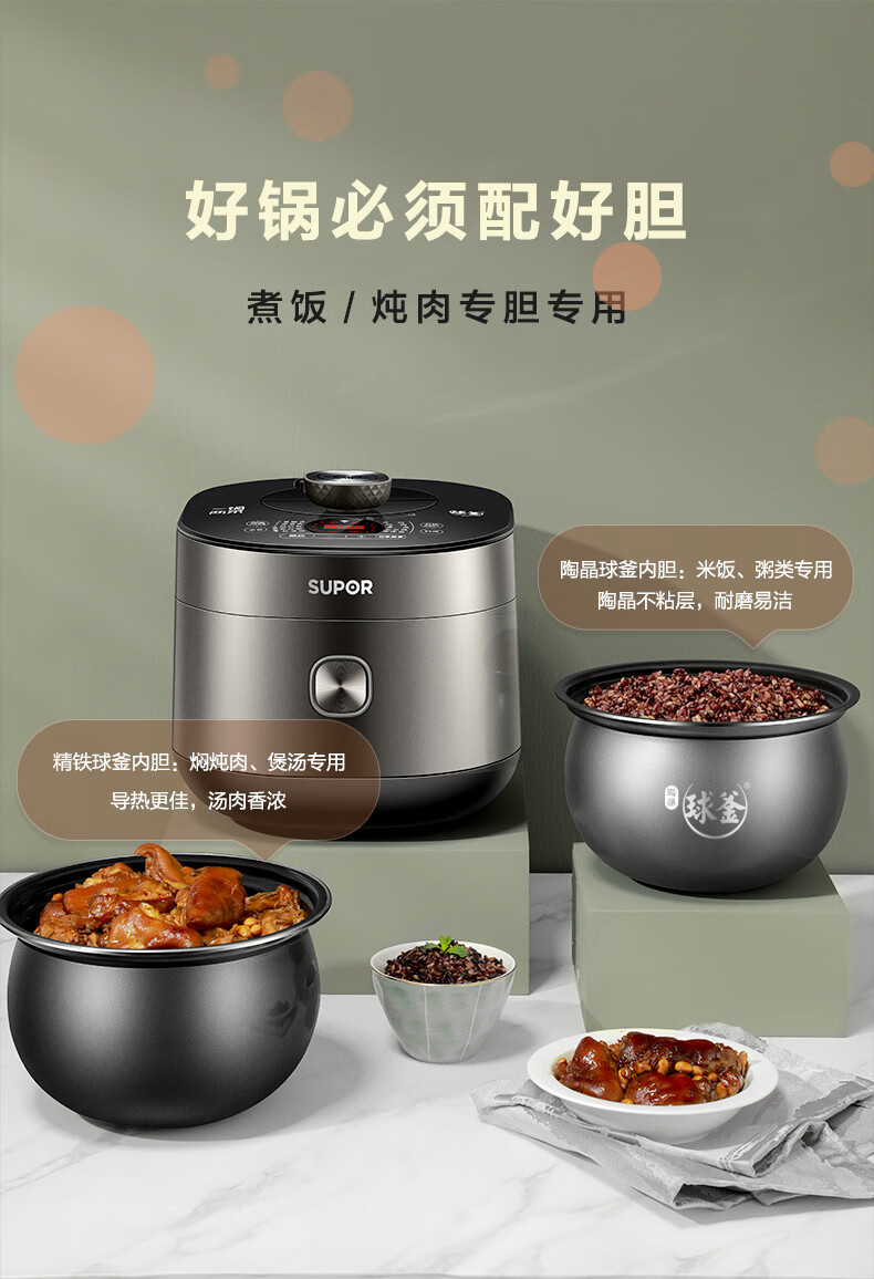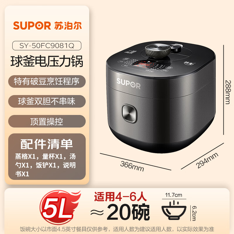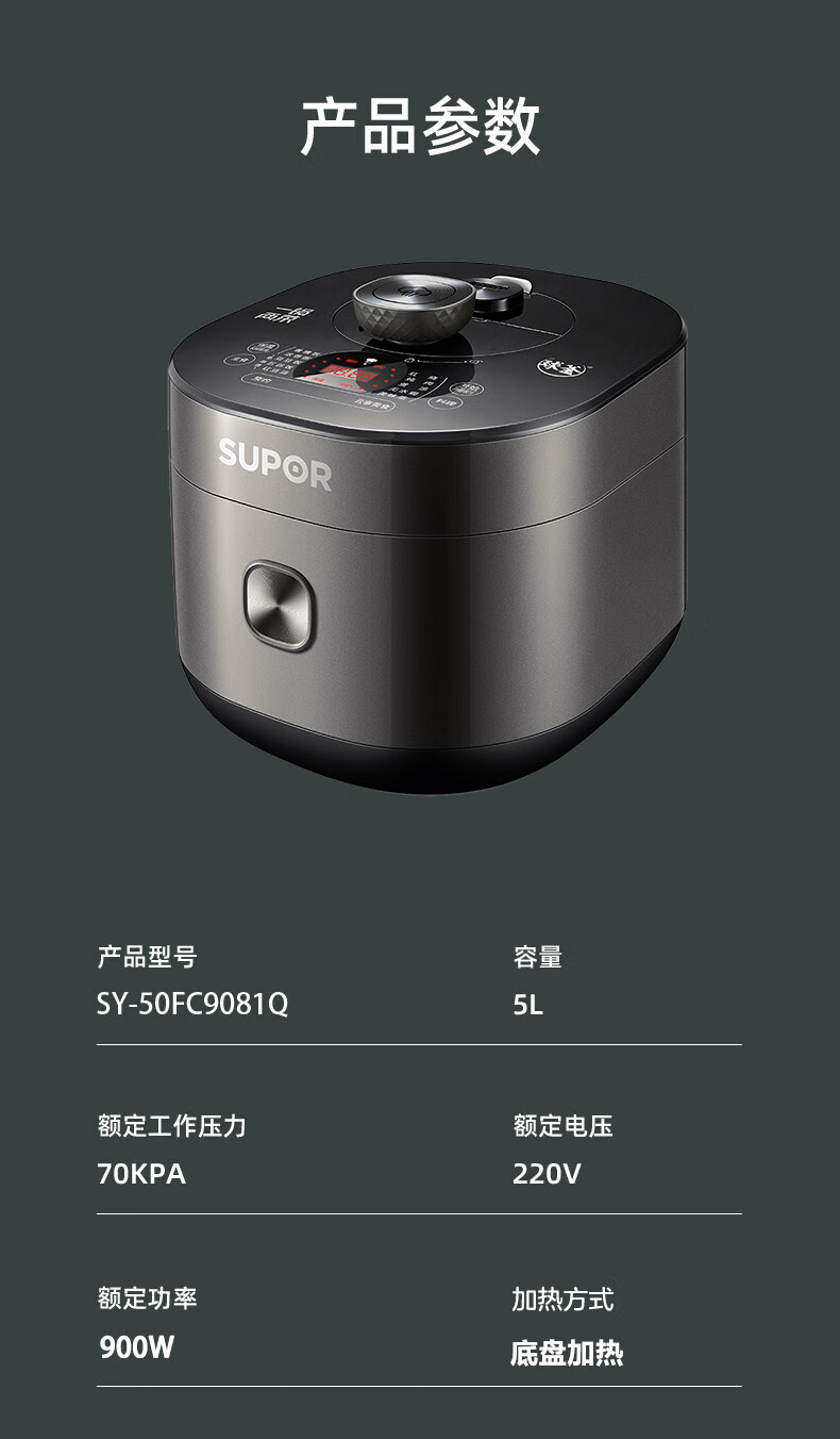 • 商品名称:苏泊尔(SUPOR)全自动智能预约电压力锅5L家用蒸笼上蒸下煮球釜双胆50FC9081Q电饭煲高压锅4-6人 SY-50FC9081Q/台