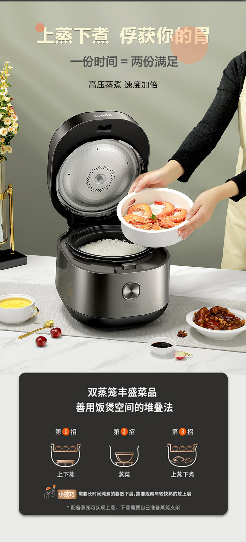 苏泊尔(SUPOR)全自动智能预约电压力锅5L家用蒸笼上蒸下煮球釜双胆50FC9081Q电饭煲高压锅4-6人 SY-50FC9081Q/台