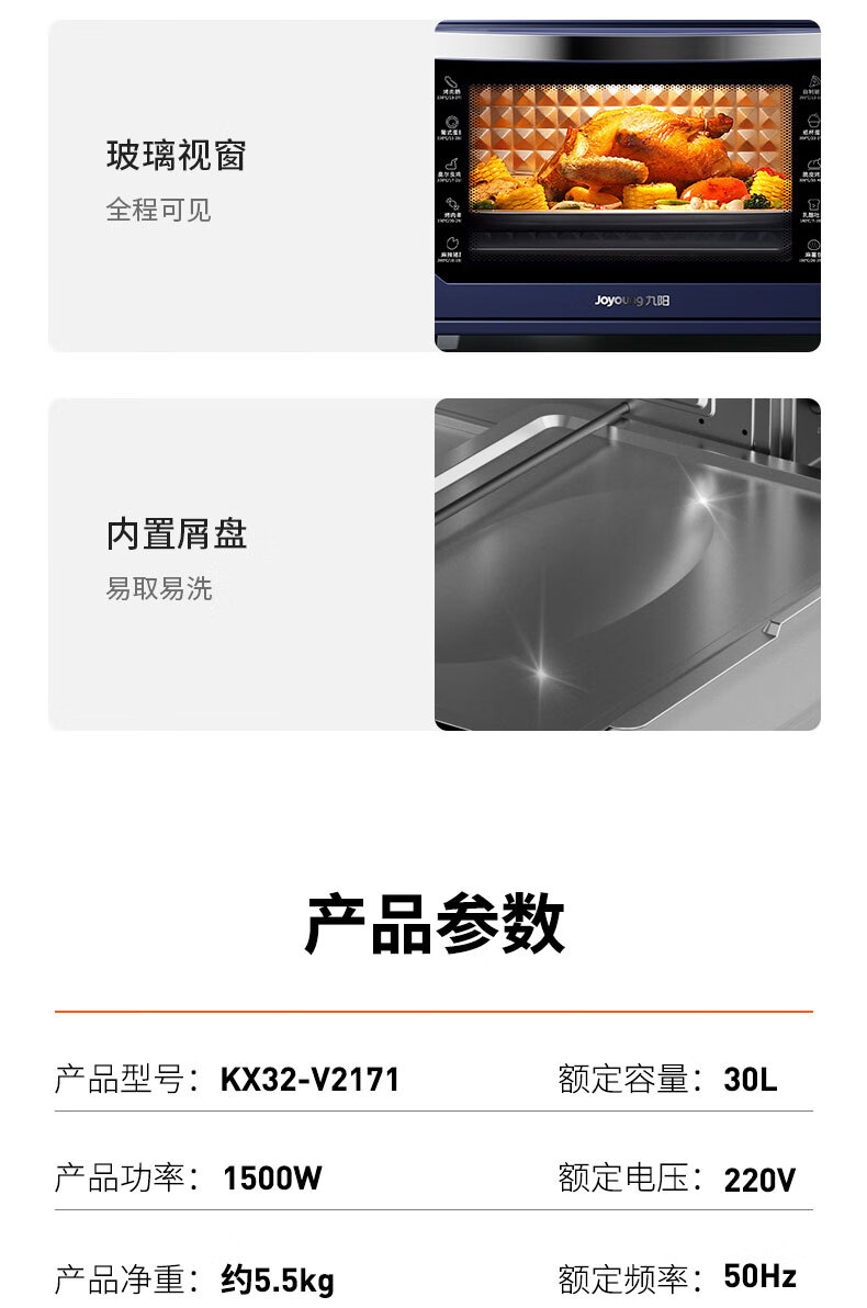 • 商品名称:九阳(Joyoung)电烤箱家用多功能专业30L大容量烘焙电烤箱精准定时控温专业烘焙易操作KX32-V2171 KX32-V2171/台