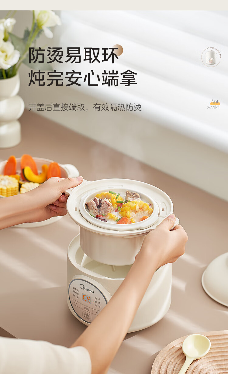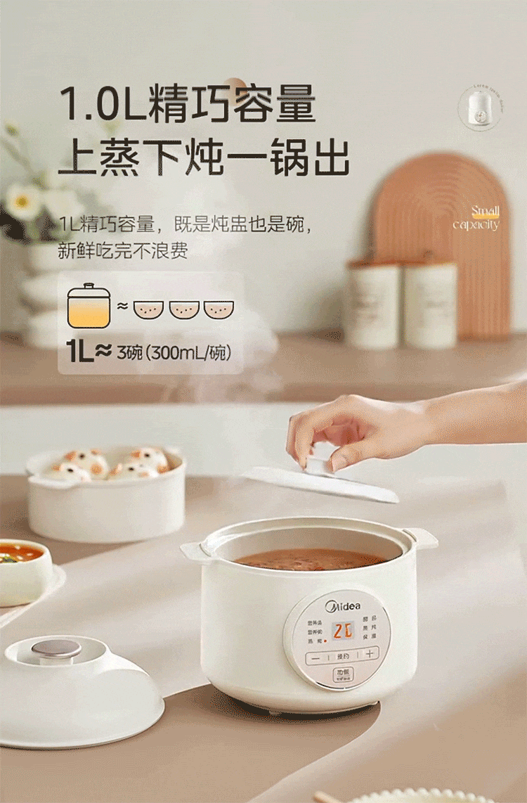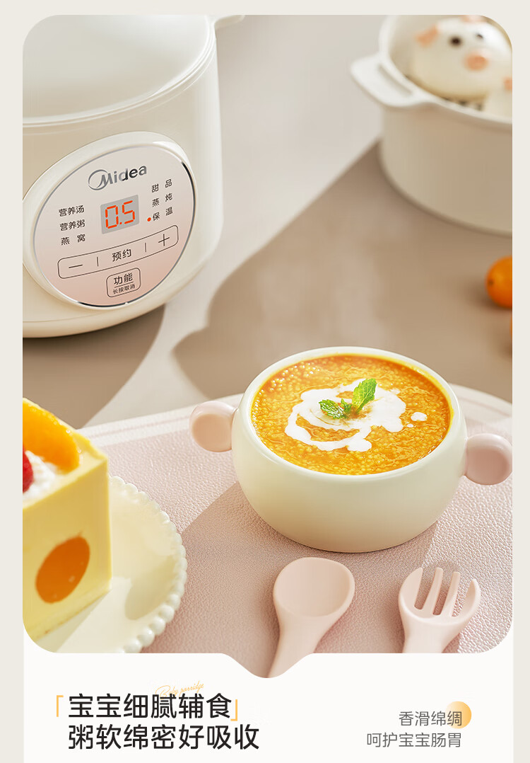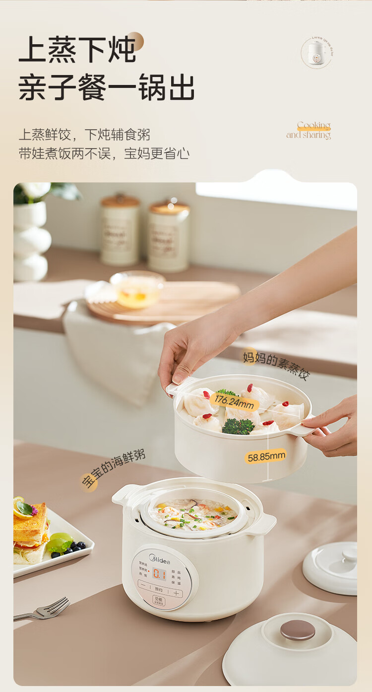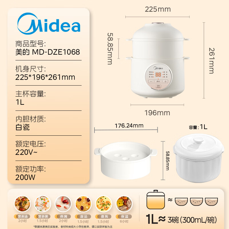 美的(Midea)电炖锅电蒸锅煮粥婴儿辅食锅电砂锅炖汤盅煲汤锅熬粥炖盅1L白瓷隔水炖蒸炖一体多功能锅MD-DZE1068 MD-DZE1068/台