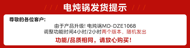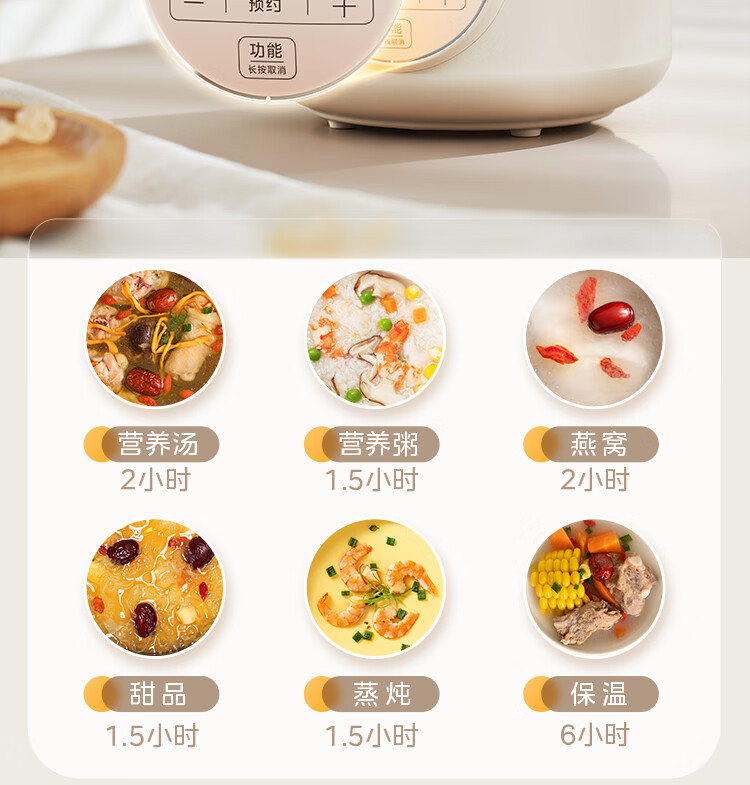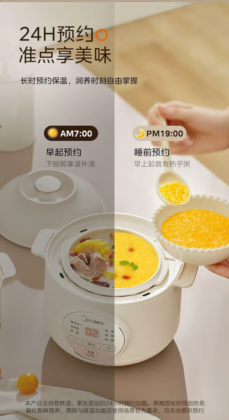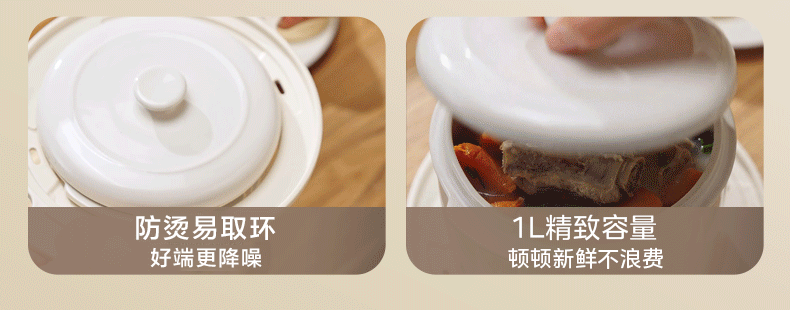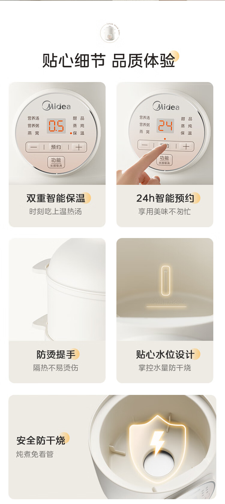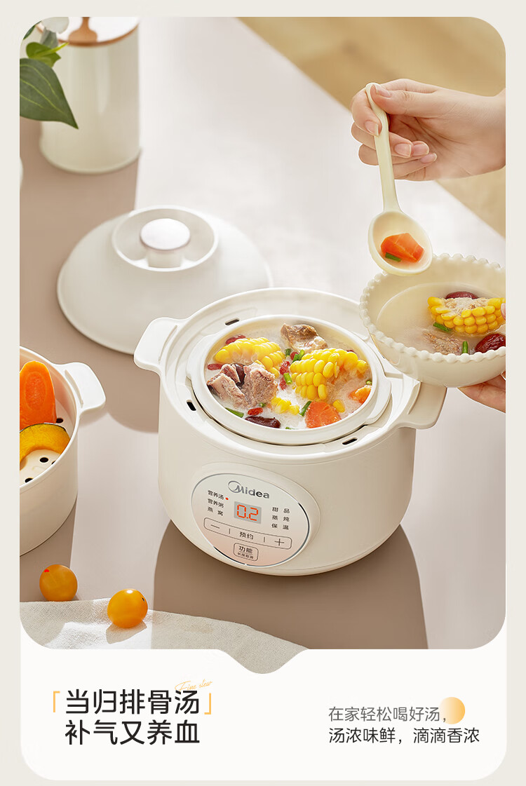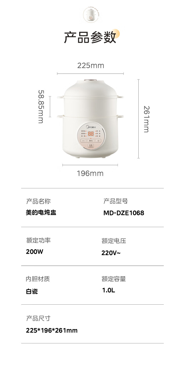 • 商品名称:美的(Midea)电炖锅电蒸锅煮粥婴儿辅食锅电砂锅炖汤盅煲汤锅熬粥炖盅1L白瓷隔水炖蒸炖一体多功能锅MD-DZE1068 MD-DZE1068/台