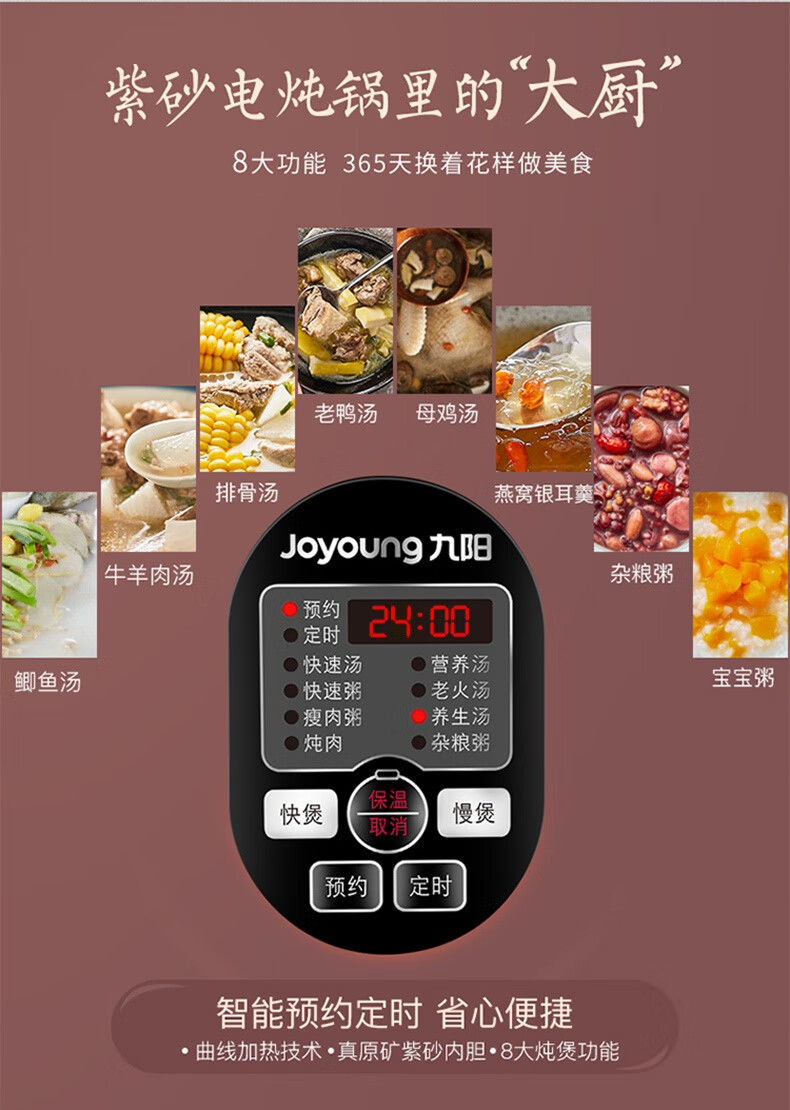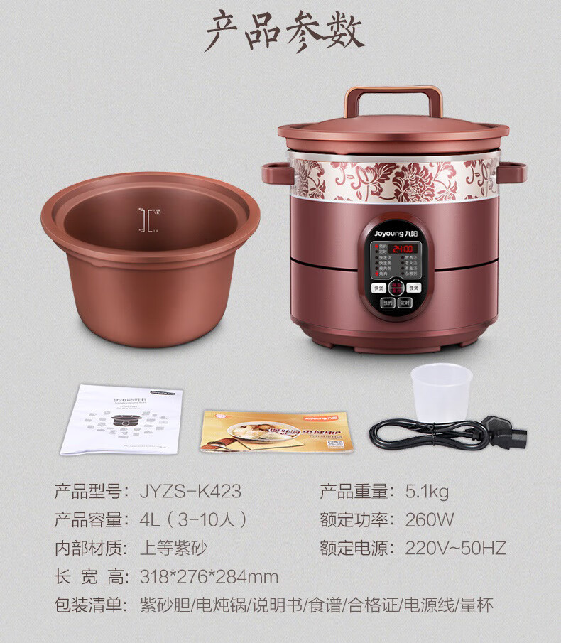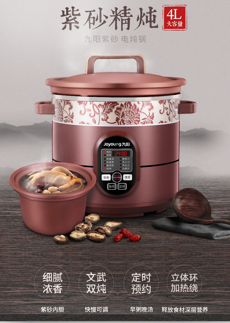• 商品名称:九阳(Joyoung)电炖锅 炖盅隔水炖锅 预约家用炖锅 陶瓷煲汤锅电砂锅4升 K423【企业采购】【支持一件代发】 K423/台