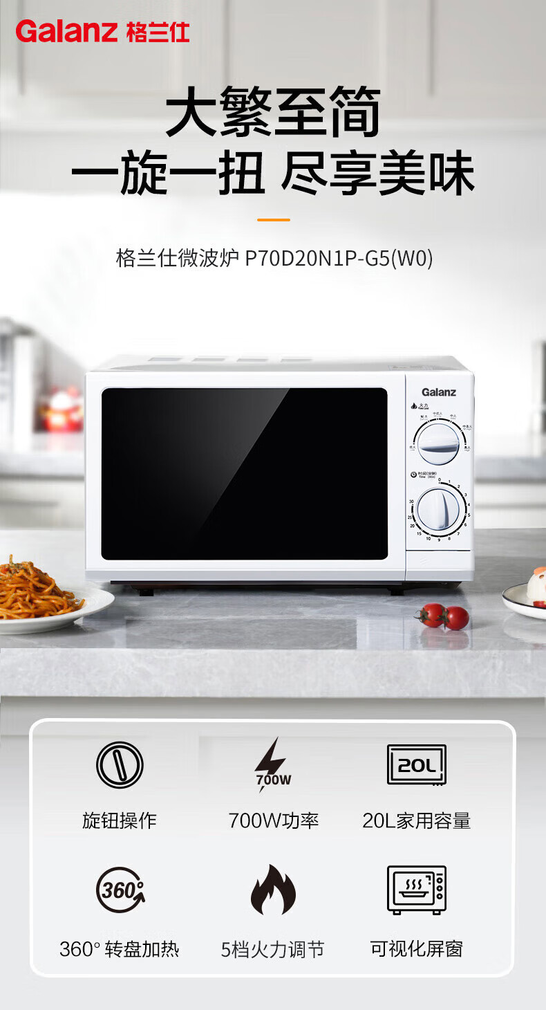 家用电器  > 厨房小电  > 微波炉  >  格兰仕/Galanz  >  格兰仕(Galanz)20升家用便携式微波炉 五档火力 营养解冻 内胆易清洁 转盘式P70D20N1P-G5(W0) P70D20N1P-G5(W0)/台