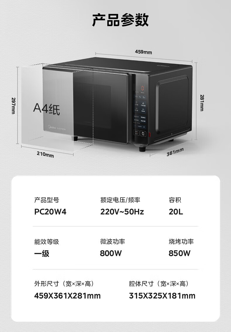 • 商品名称:美的(Midea)20升小型家用微波炉 微烤一体机 800W速热 变频 一级能效 快速解冻 PC20W4 PC20W4/台