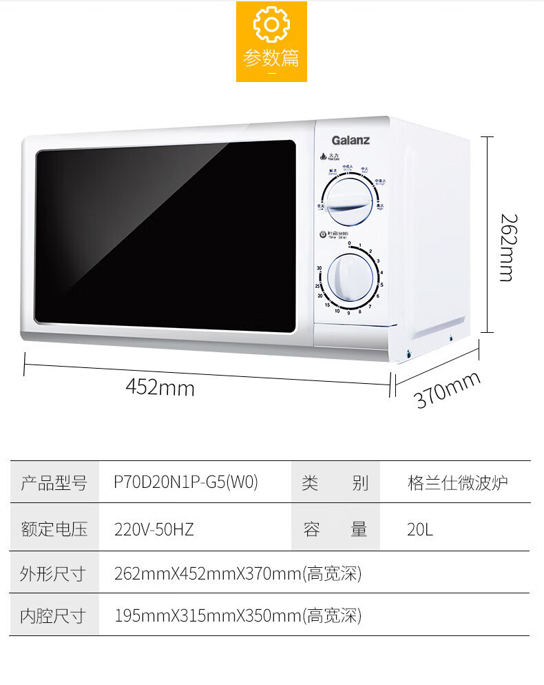 商品名称: 格兰仕(Galanz)20升家用便携式微波炉 五档火力 营养解冻 内胆易清洁 转盘式P70D20N1P-G5(W0) P70D20N1P-G5(W0)/台