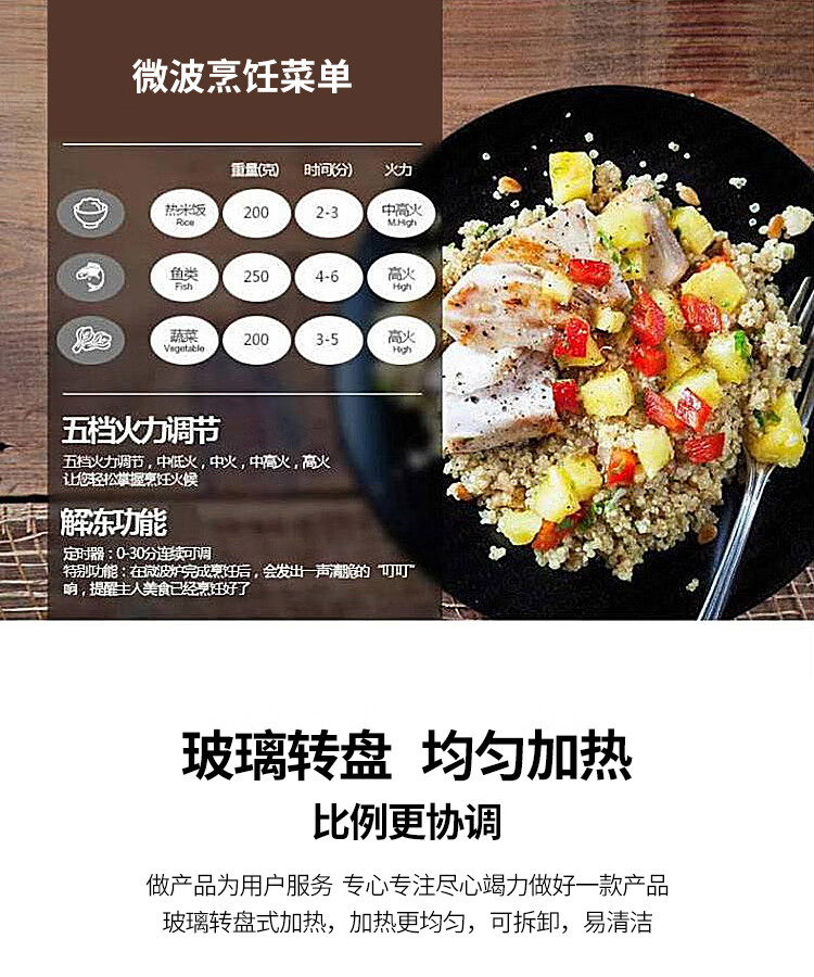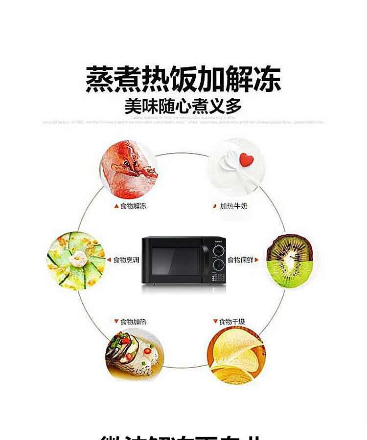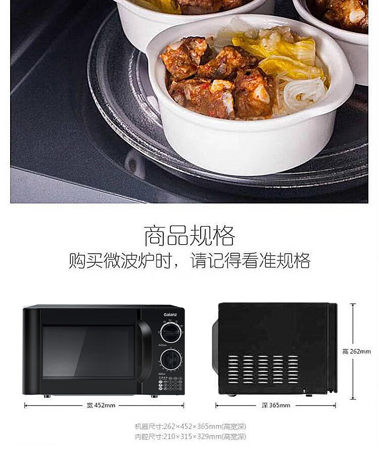 包装清单: 产品尺寸:452*365*262mm 包装尺寸:532x445x328mm 类型:转盘加热 额定电压及额定频率:220V/50HZ 微波输出功率:700W 产品毛重:12.5KG 产品净重: 产品规格:20L/机械旋钮式