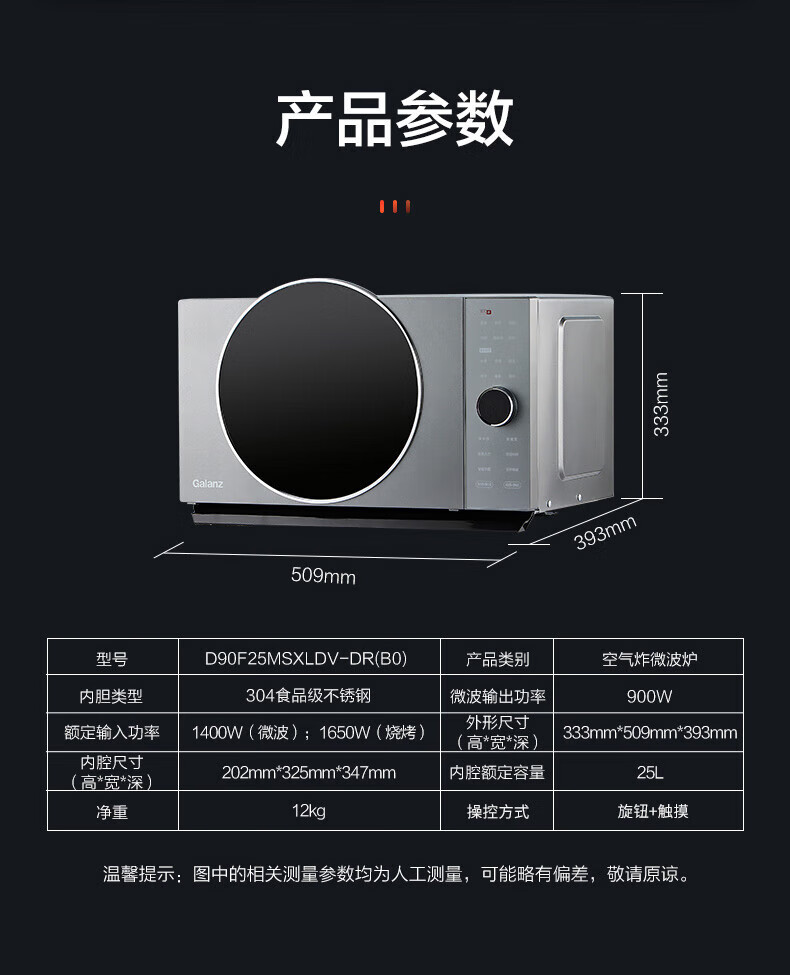 商品名称: 格兰仕(Galanz)微波炉 25升大容量900w大功率不锈钢内胆空气炸微波炉 黑色 D90F25MSXLDV-DR(B0) 企业业务 D90F25MSXLDV-DR(B0)/台