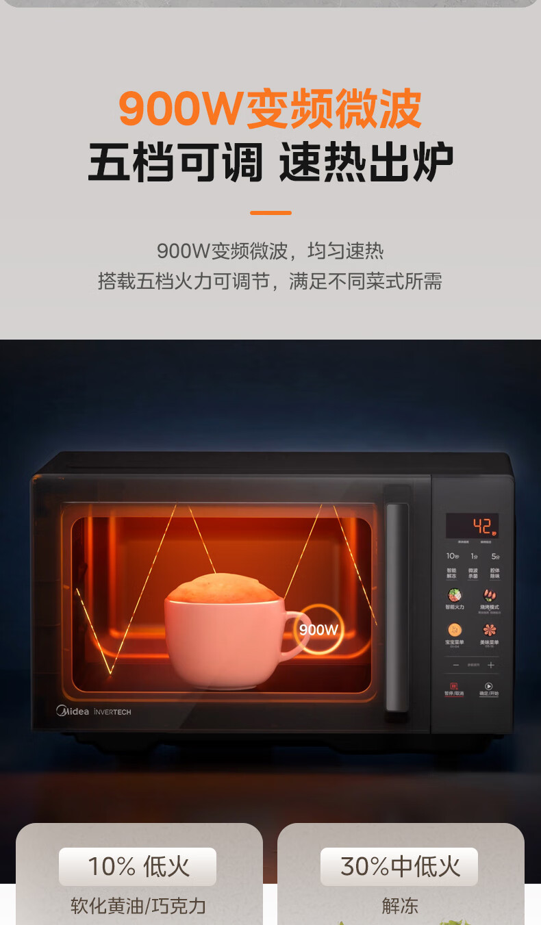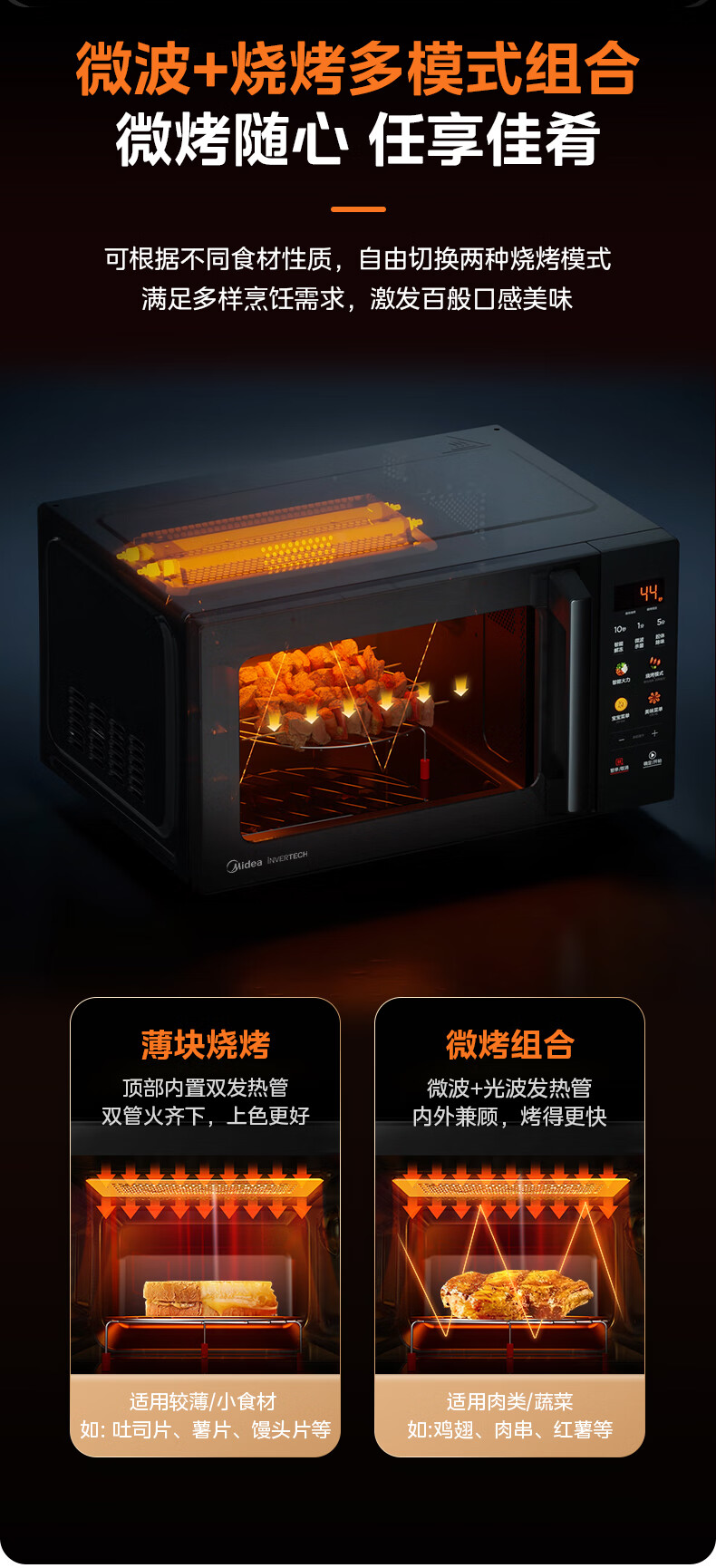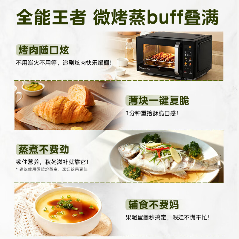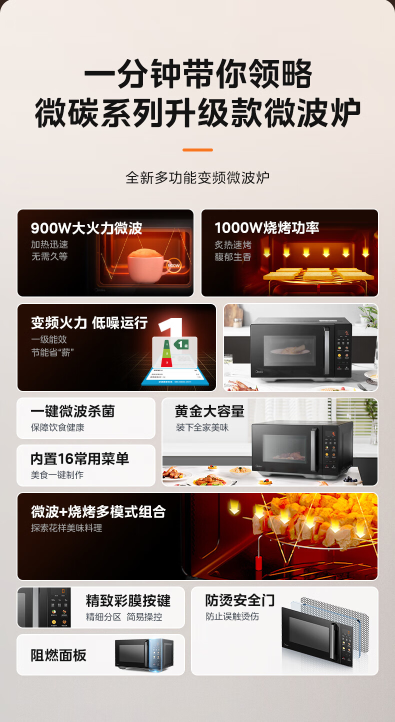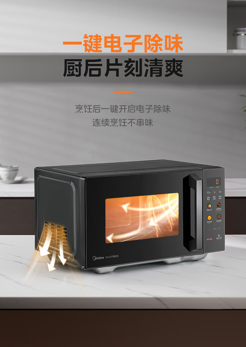 • 商品名称:美的(Midea)微碳微波炉烤箱一体机900w微波1000w烧烤平板光波速热23L容量变频臻彩荧幕 (C32) C32/台