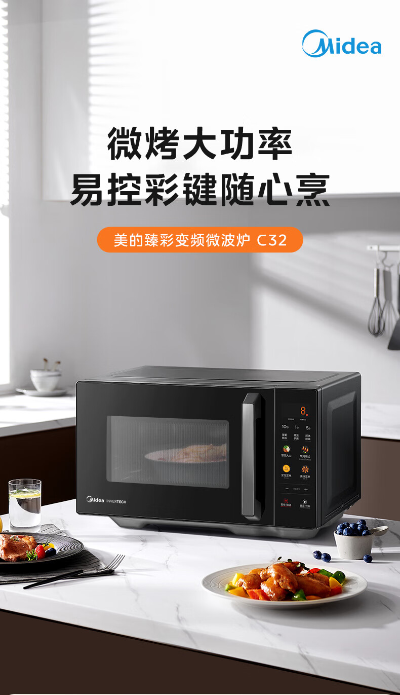 家用电器  > 厨房小电  > 微波炉  >  美的/MIDEA  >  美的(Midea)微碳微波炉烤箱一体机900w微波1000w烧烤平板光波速热23L容量变频臻彩荧幕 (C32) C32/台