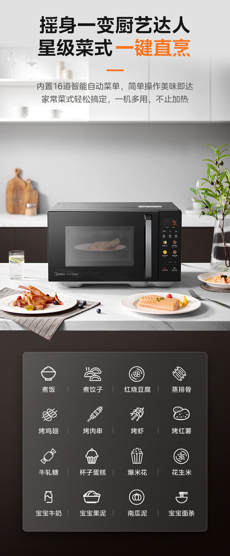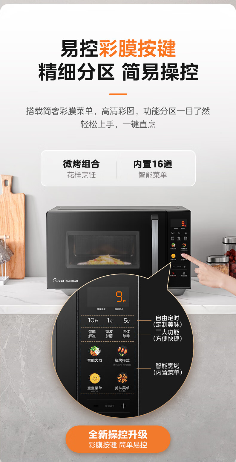 商品名称: 美的(Midea)微碳微波炉烤箱一体机900w微波1000w烧烤平板光波速热23L容量变频臻彩荧幕 (C32) C32/台