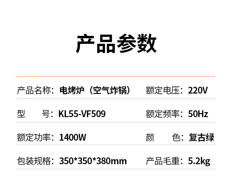 商品名称: 九阳(Joyoung) 家用多功能 空气炸锅 KL55-VF509 不沾易清洗 准确定时 低脂 无油煎炸 5.5L大容量 KL55-VF509/个