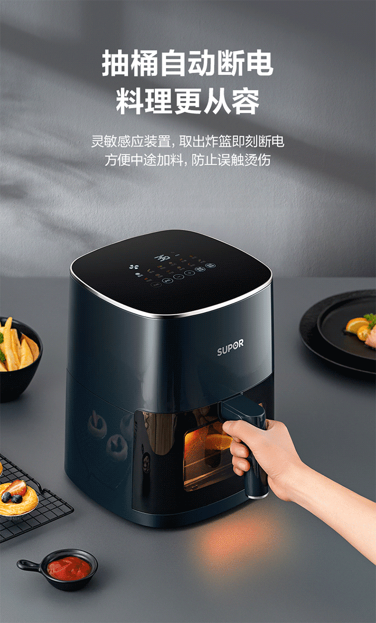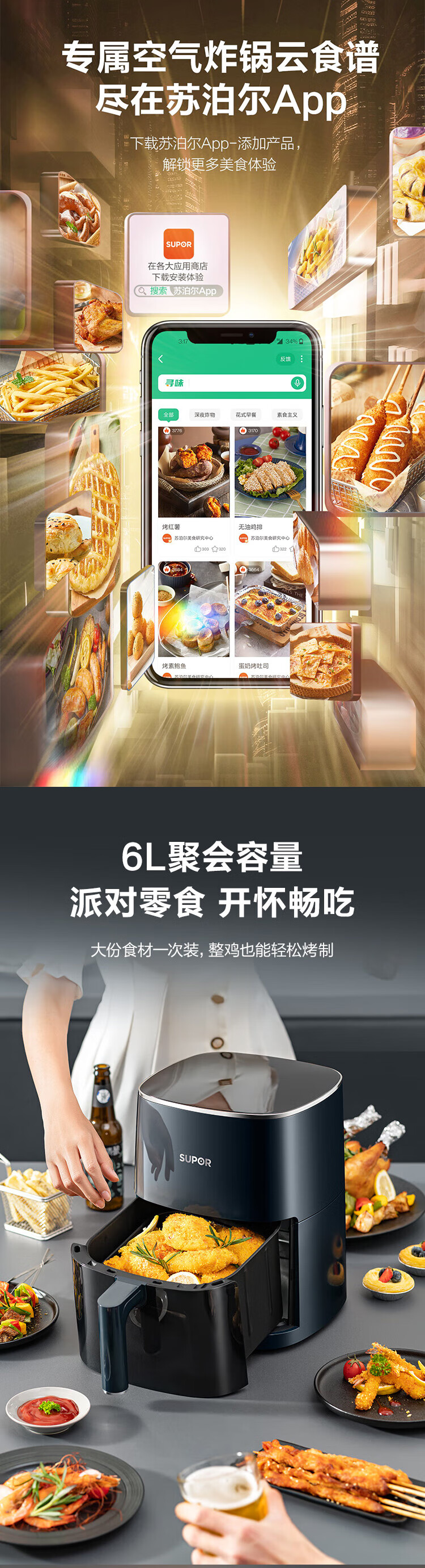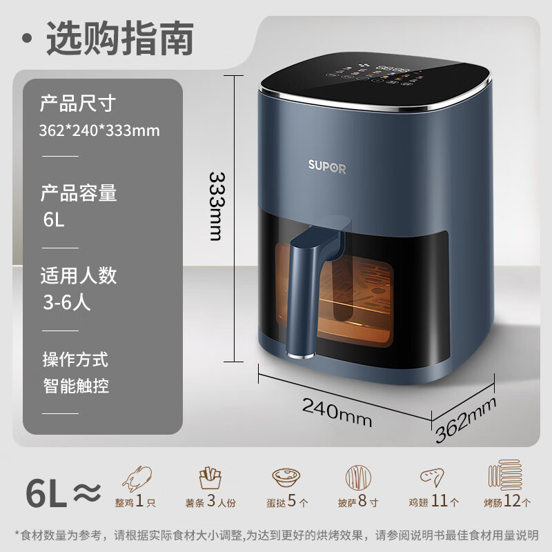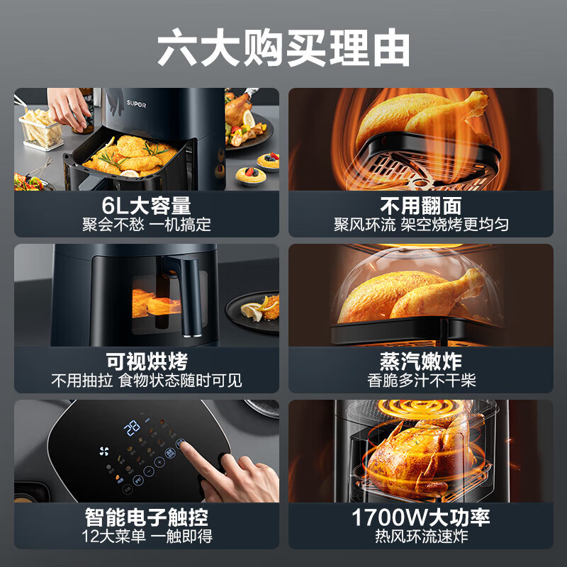 • 商品名称:苏泊尔(SUPOR)空气炸锅不用翻面 家用全自动 6L大容量 可视 蒸汽嫩炸 智能多功能电炸锅KD60D830A KD60D830A/台