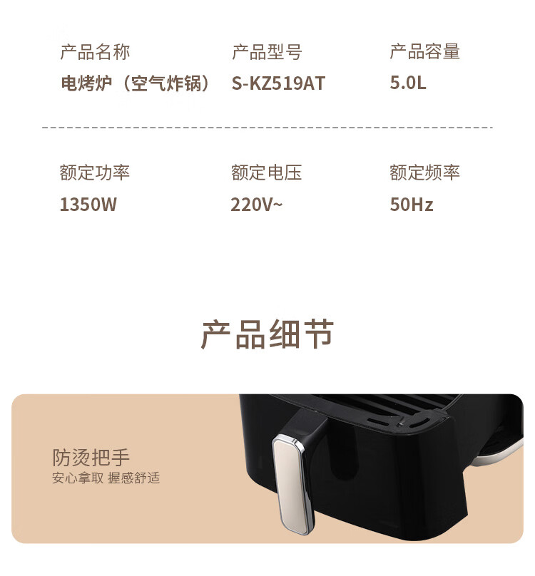 家用电器  > 厨房小电  > 空气炸锅  >  尚朋堂  >  尚朋堂空气炸锅家用大容量可视多功能炸鸡薯条电炸锅 【云峰白】 5L S-KZ519AT 空气炸锅 SPT-KZ0412A-D03/个