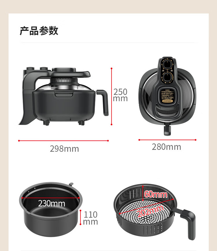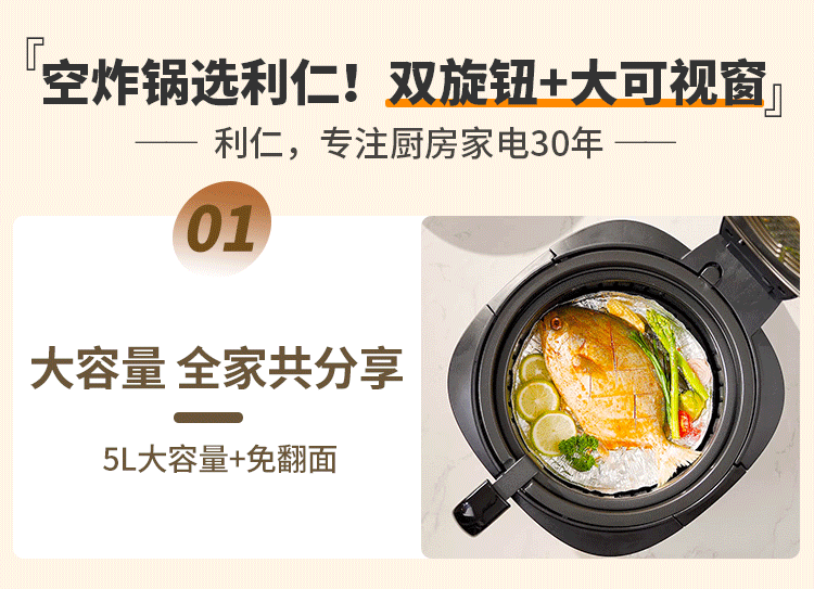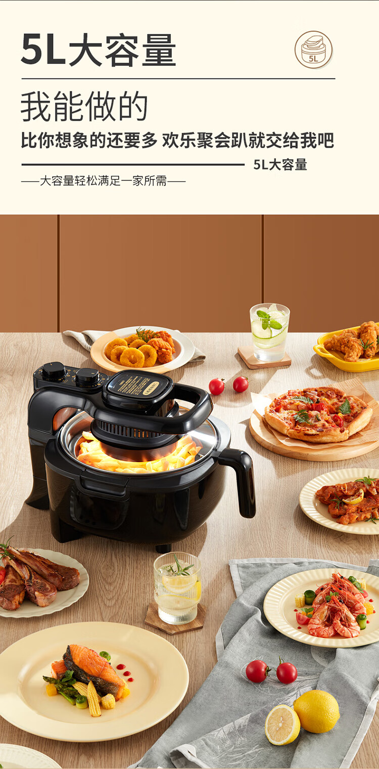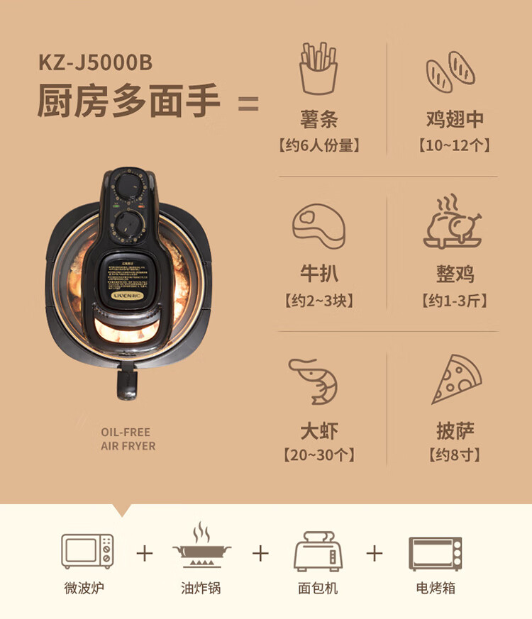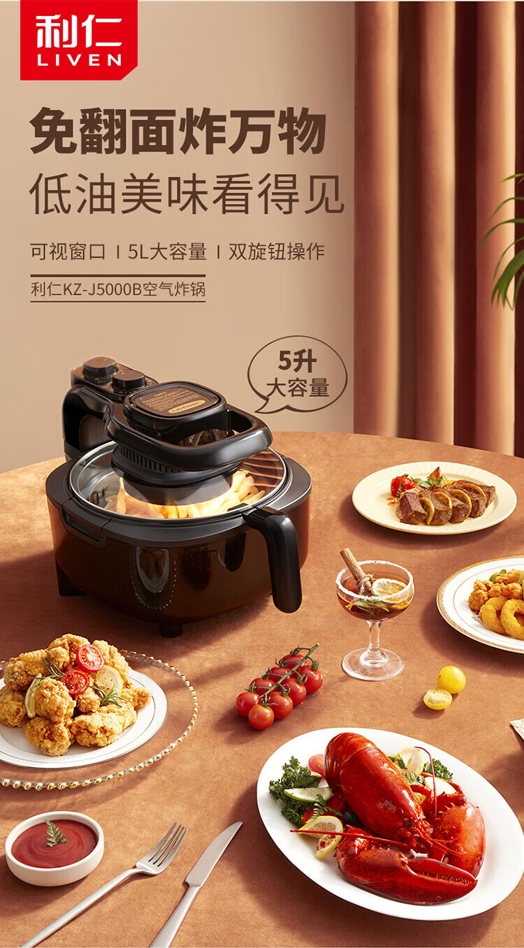 • 商品名称:利仁(Liven)空气炸锅可视家用5升大容量无油电炸锅蒸汽炸锅 多功能空气炸锅炸烤一体烤箱薯条机KZ-J5000B KZ-J5000B/台