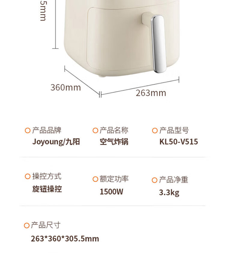 商品名称: 九阳(Joyoung)家用立体不用反面薯条机调温调时5.3L不沾易清洗空气炸锅KL50-V515 KL50-V515/台