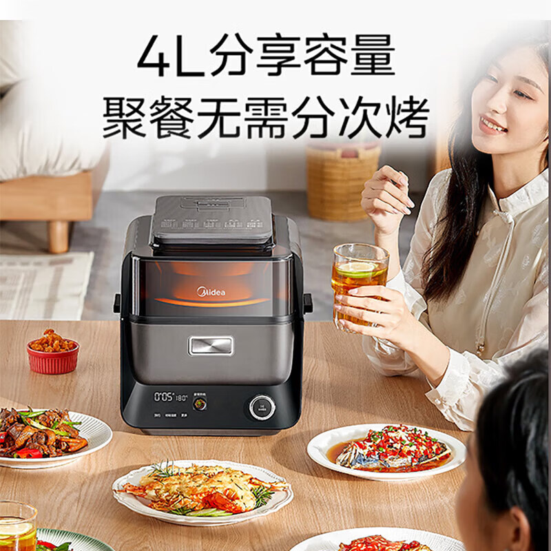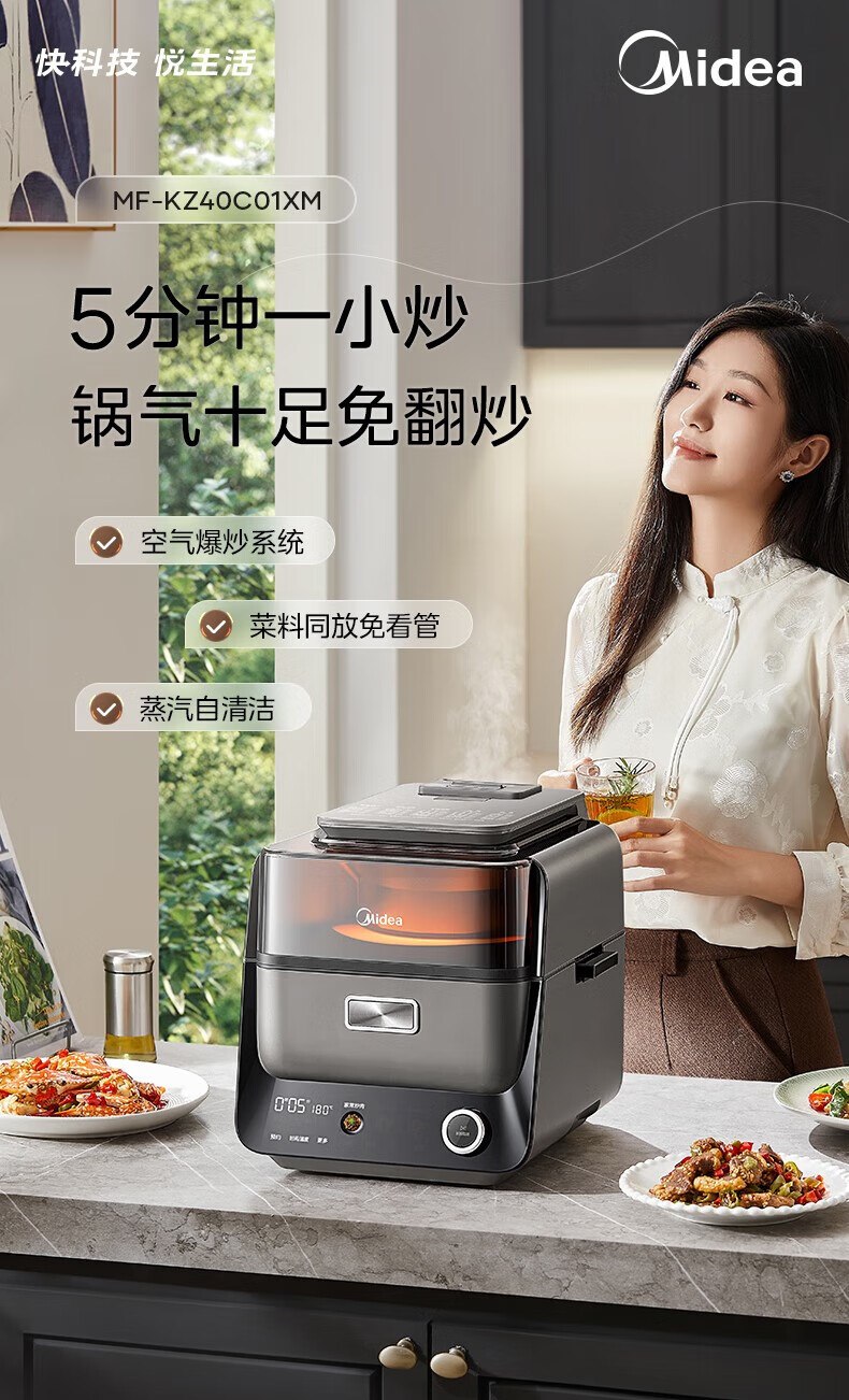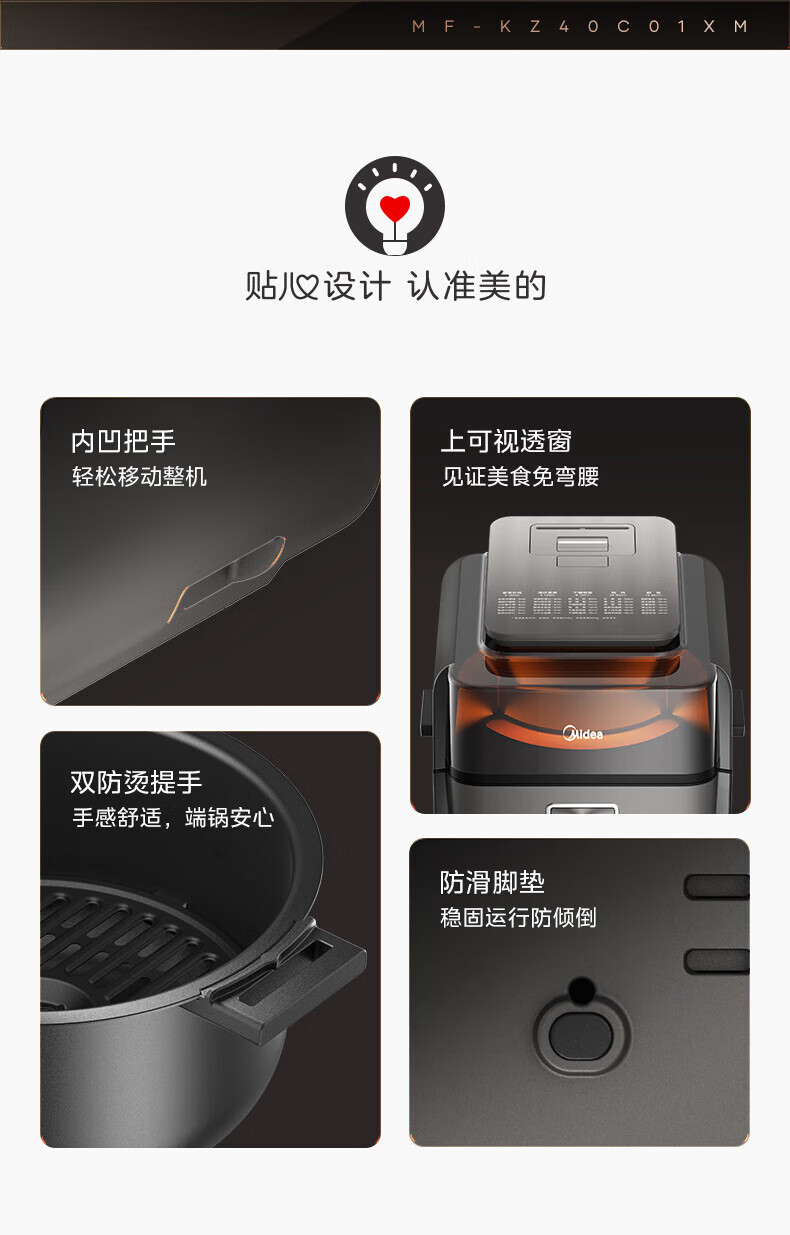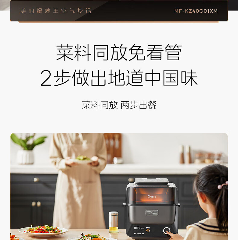 美的(Midea)空气炸可视仓爆炒锅4L容量多功能上下炭纤维热源免翻面炒恒温备长炭易洁内锅 KZC40C01 MF-KZC40C01XM/台