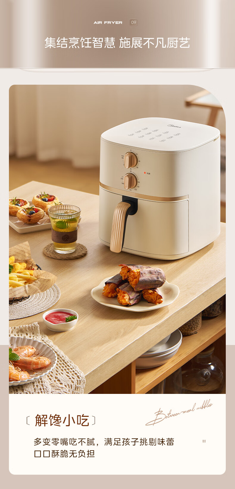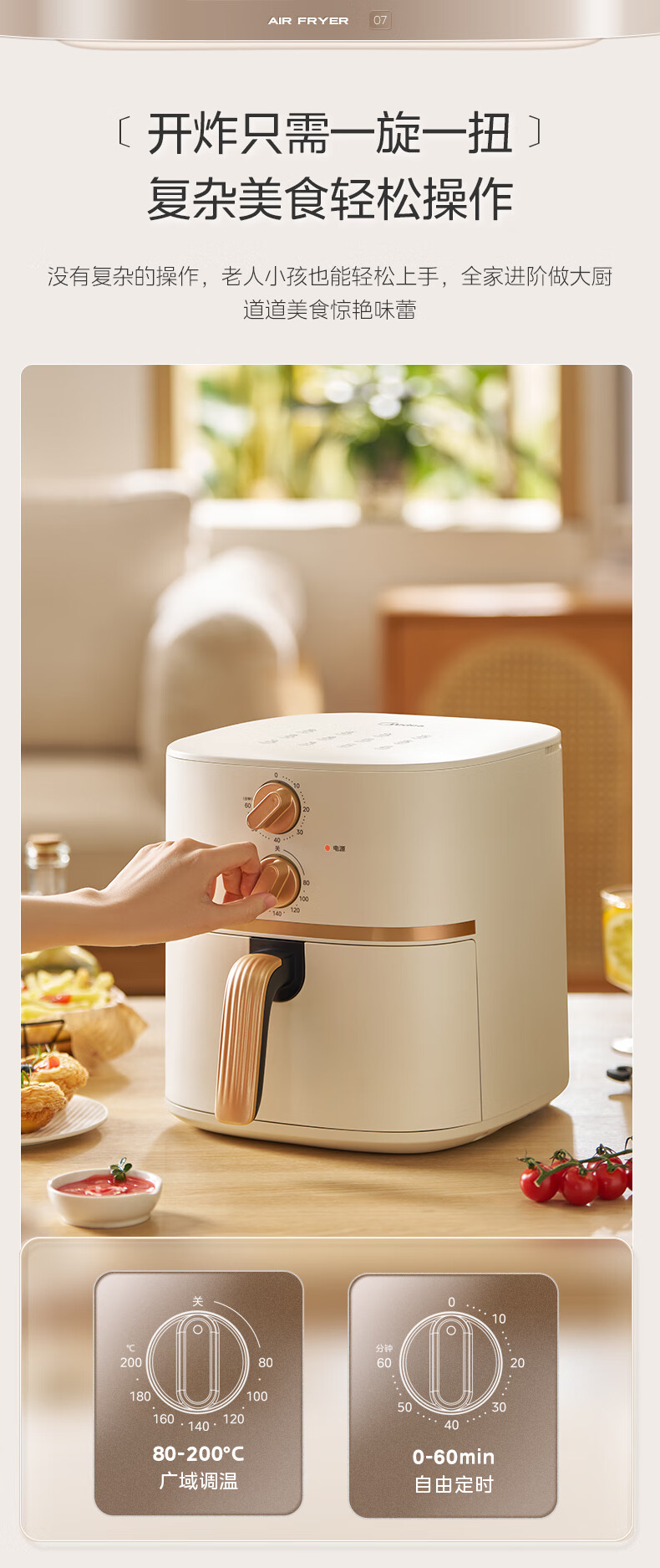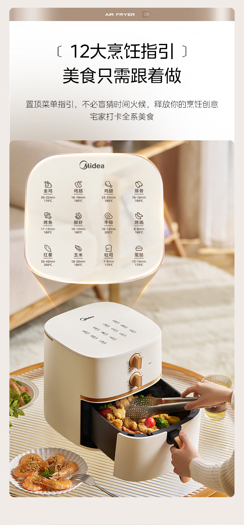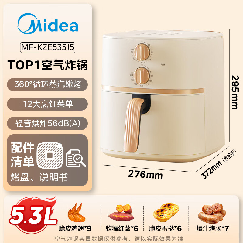 美的(Midea)空气炸锅免翻面双旋钮家用大容量5.3L多功能空气炸锅蒸烤一体热风循环金属内腔 MF-KZE535J5 MF-KZE535J5/台