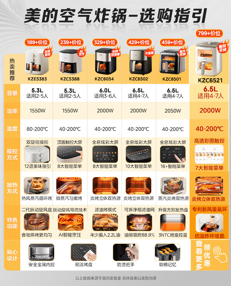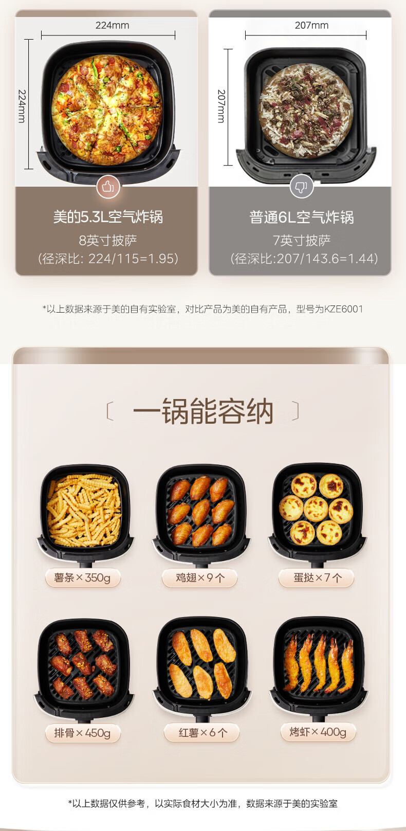 商品名称: 美的(Midea)空气炸锅免翻面双旋钮家用大容量5.3L多功能空气炸锅蒸烤一体热风循环金属内腔 MF-KZE535J5 MF-KZE535J5/台