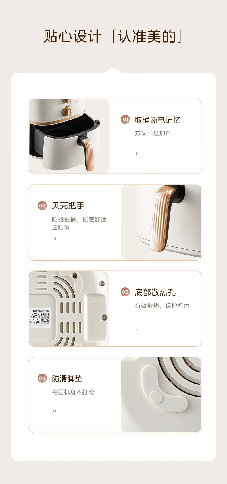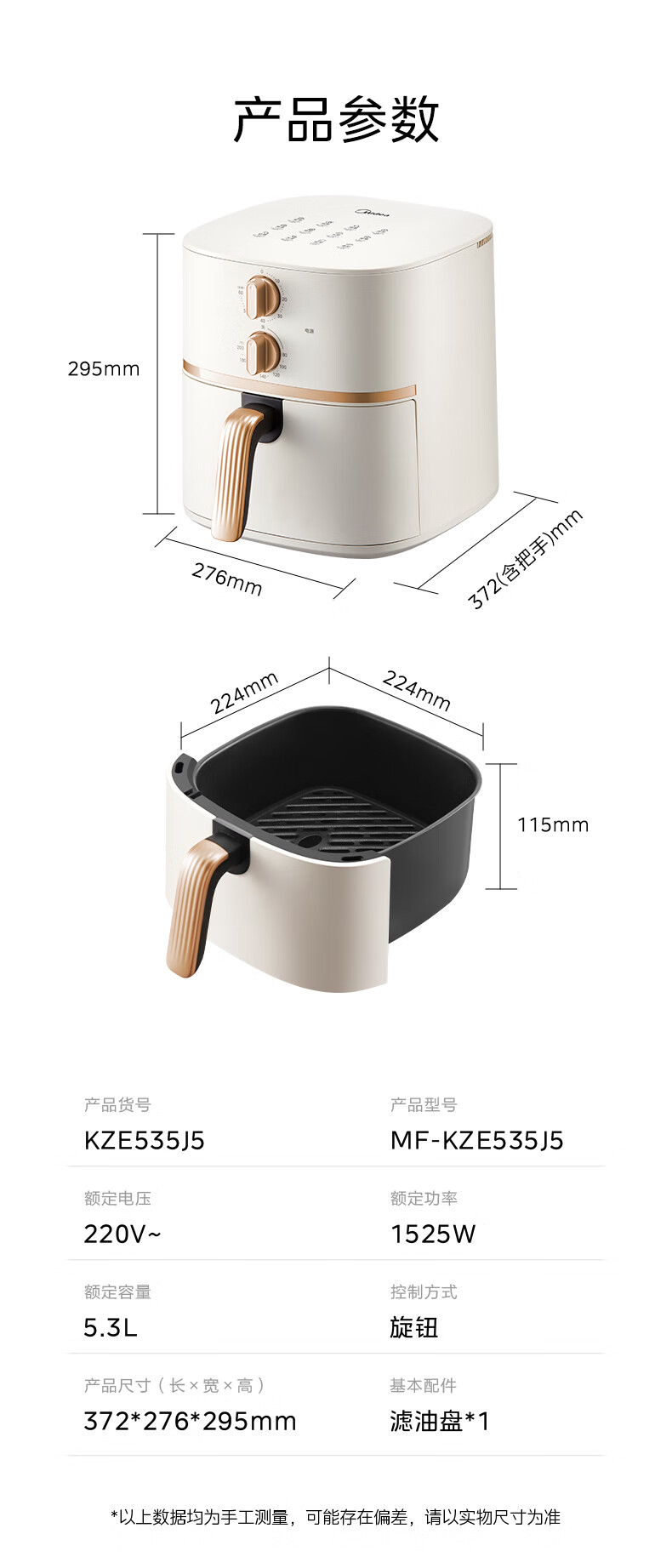 • 商品名称:美的(Midea)空气炸锅免翻面双旋钮家用大容量5.3L多功能空气炸锅蒸烤一体热风循环金属内腔 MF-KZE535J5 MF-KZE535J5/台