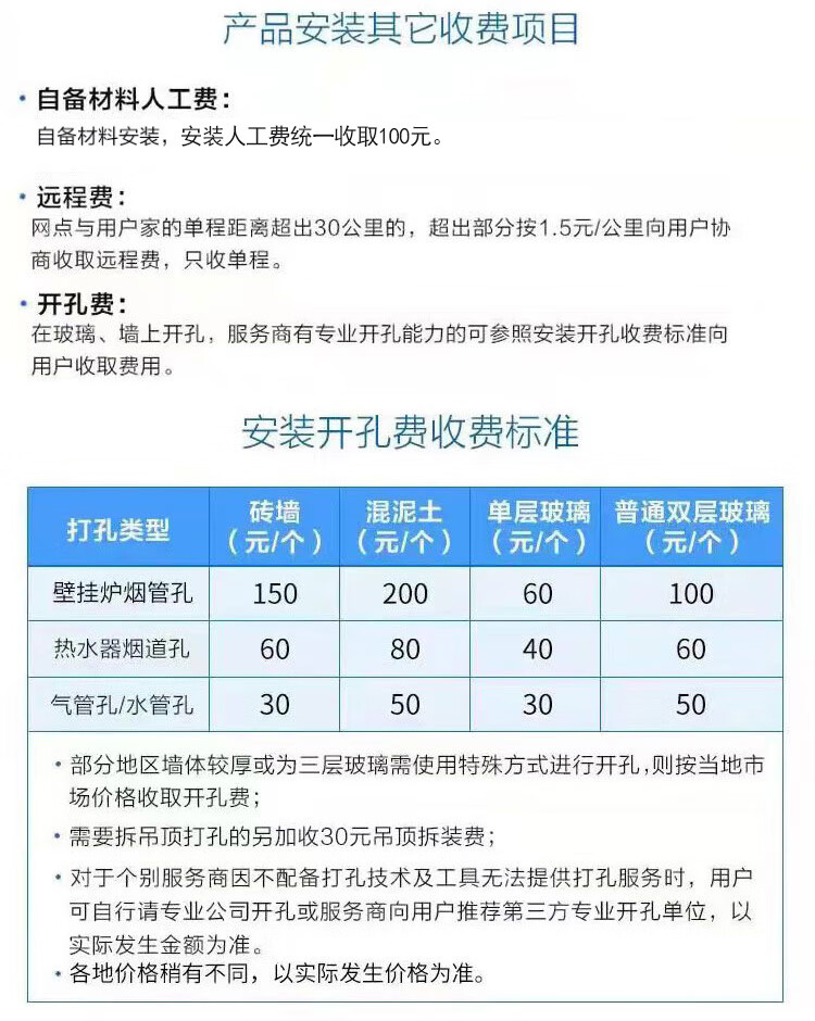 包装清单: 壁挂炉X1 说明书X1 保修卡X1 膨胀螺栓X2 自攻螺钉X4 密封垫圈X5 排烟管垫片X1 烟管密封条X2 给排烟管(单独包装)X1 木螺钉(含塑料胀管)X2
