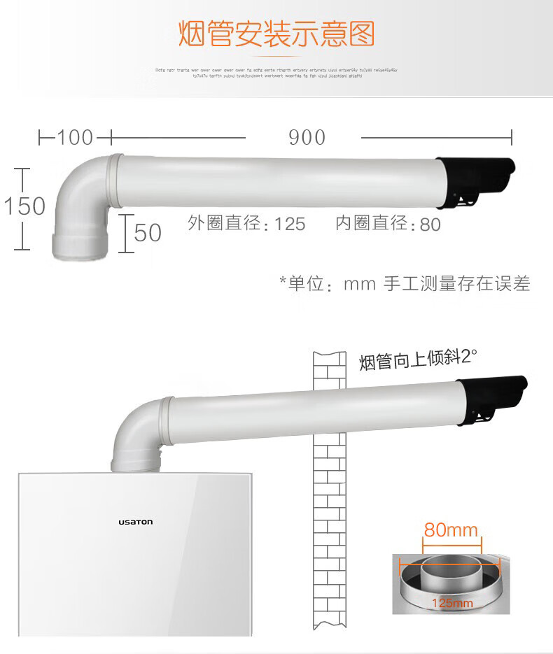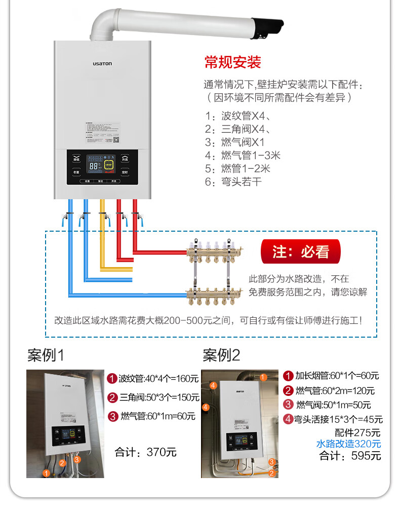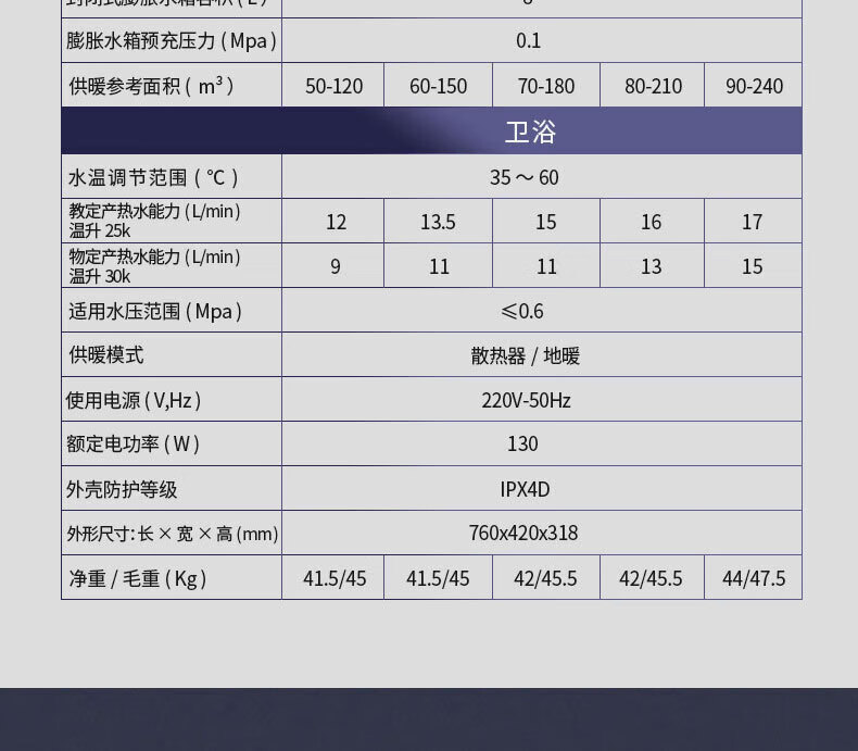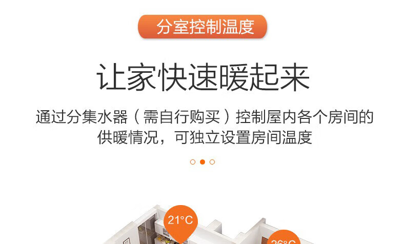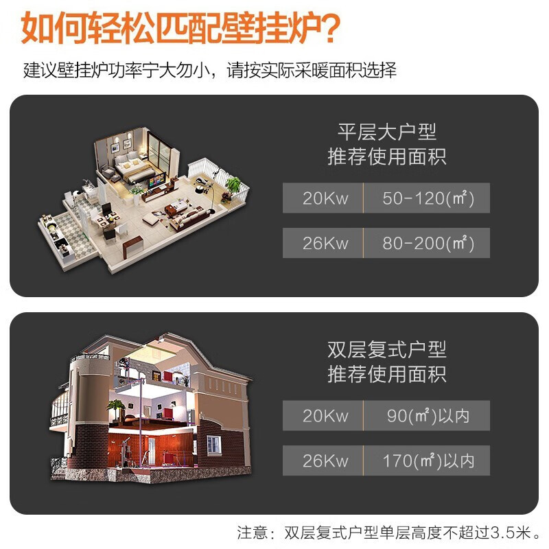 包装清单: 壁挂炉1台、使用说明书1本、小件包(螺丝等)1包、排气烟管1套。(主品与烟管配件共计2个包装)