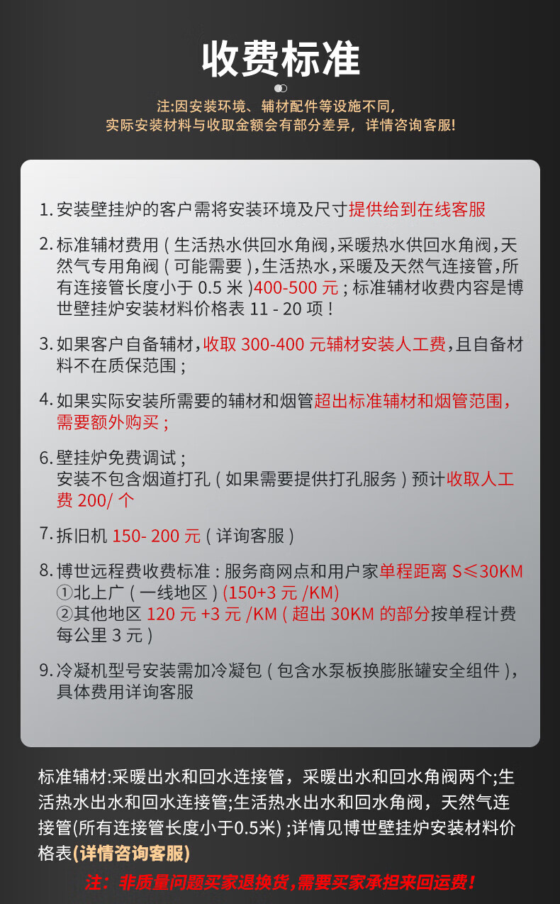 包装清单: 壁挂炉1台、说明书1本、膨胀螺栓挂钩2套