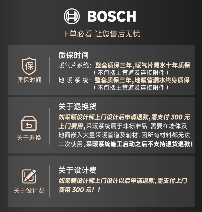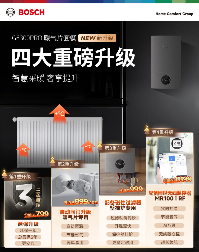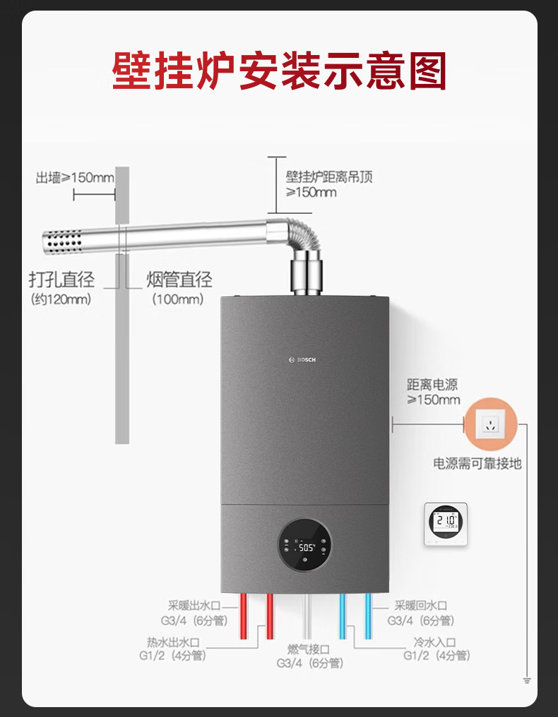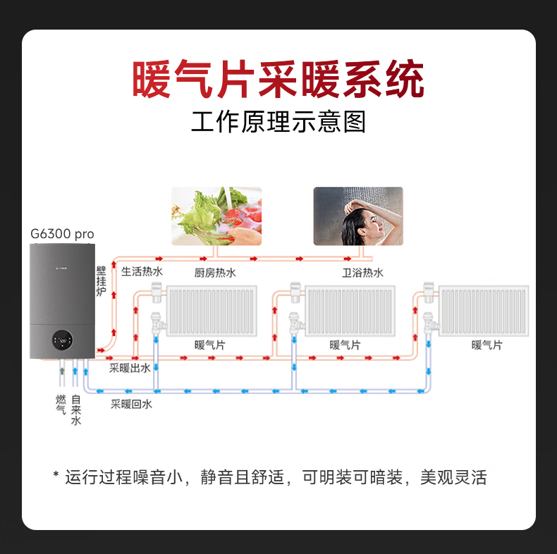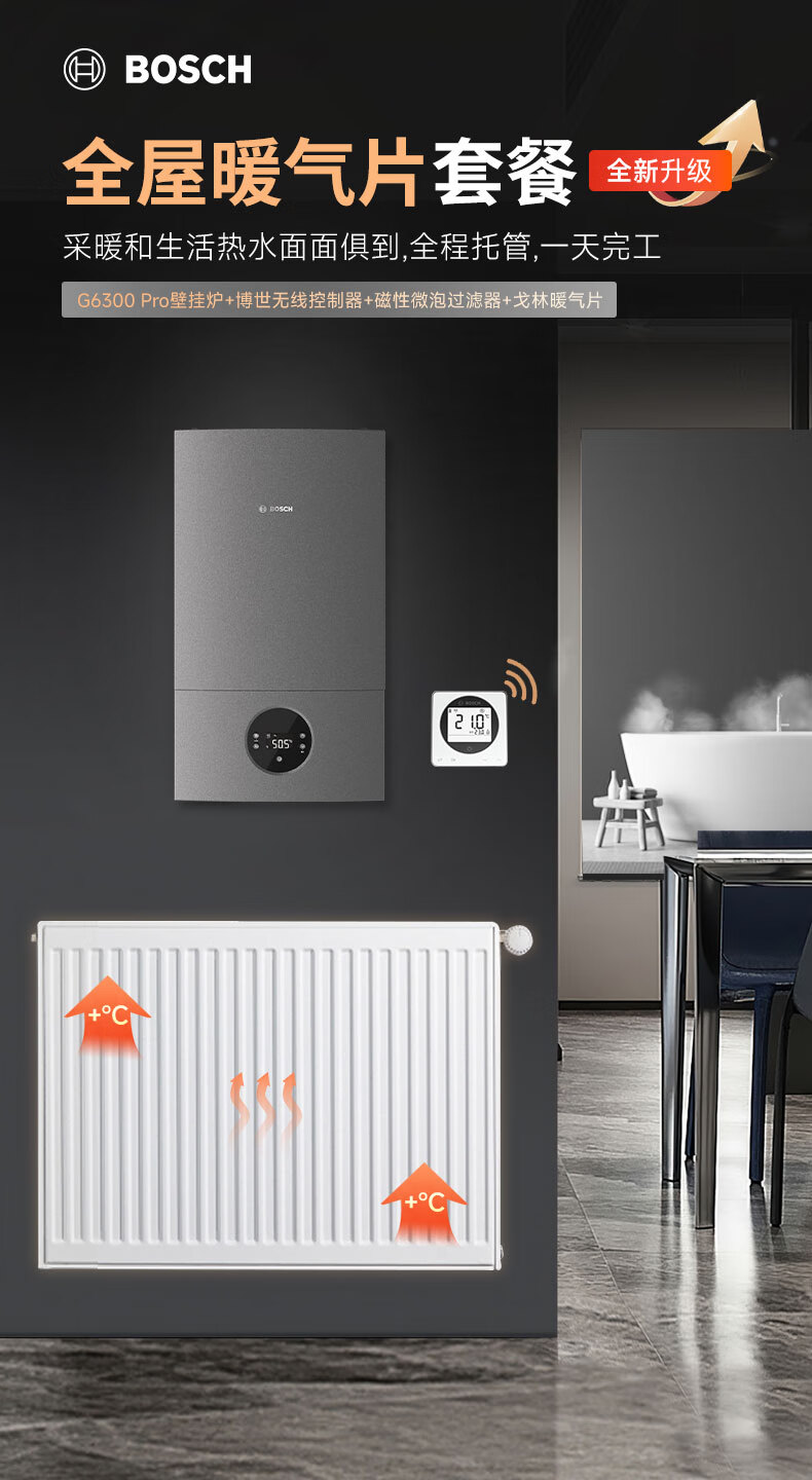 • 商品名称:博世壁挂炉戈林暖气片家用天然气采暖散热片水暖钢制壁挂式全套供暖G6300pro-24KW+五组暖气片套餐 L1P27-G6301W 24C/套