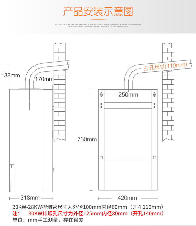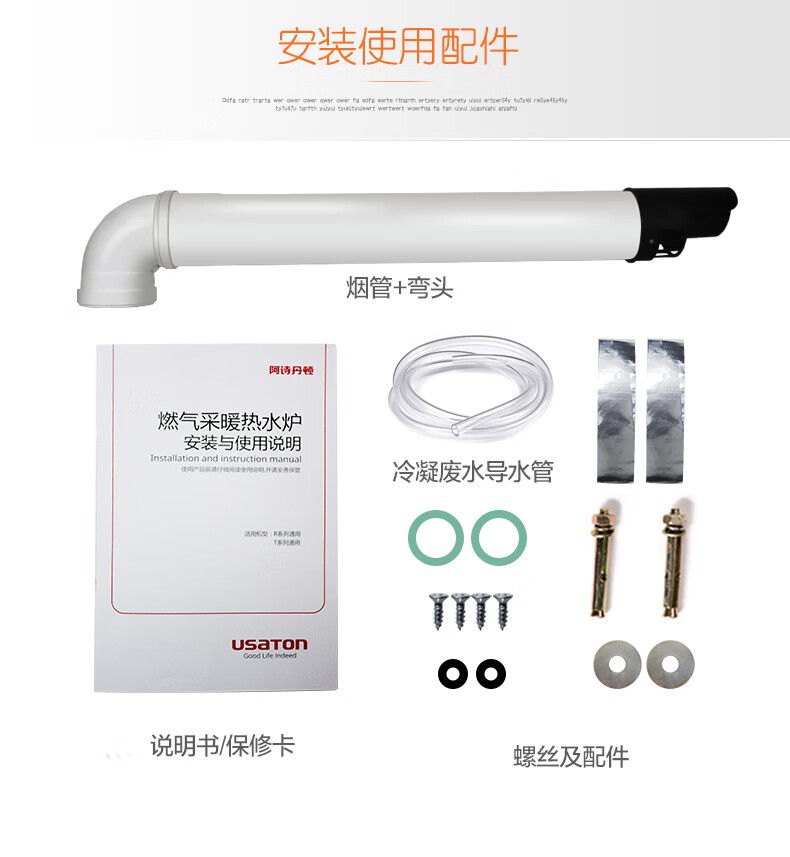 包装清单: 壁挂炉1台、使用说明书1本、小件包(螺丝等)1包、排气烟管1套。(主品与烟管配件共计2个包装)