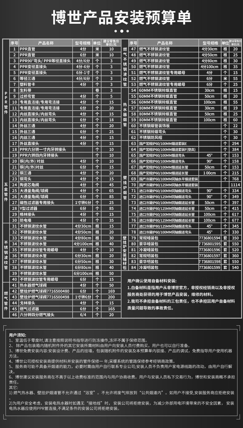 包装清单: 壁挂炉1台、说明书1本、膨胀螺栓挂钩2套