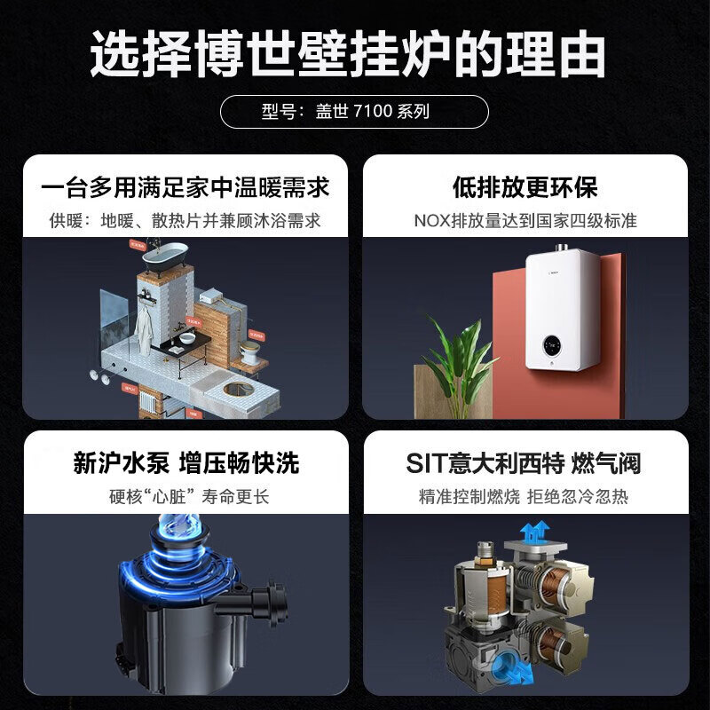 商品名称: 博世(BOSCH)燃气壁挂炉采暖炉【带货安装】家用 地暖洗浴恒温热水两用采暖炉 德国品质 盖世G7100 28KW L1P31-G7100W 28 CG/件