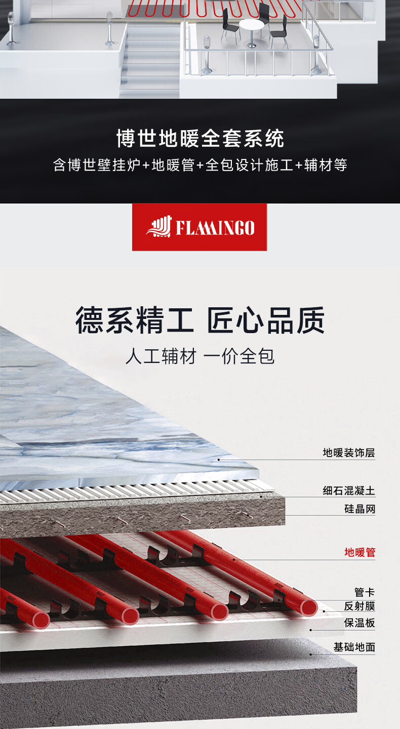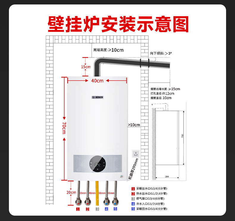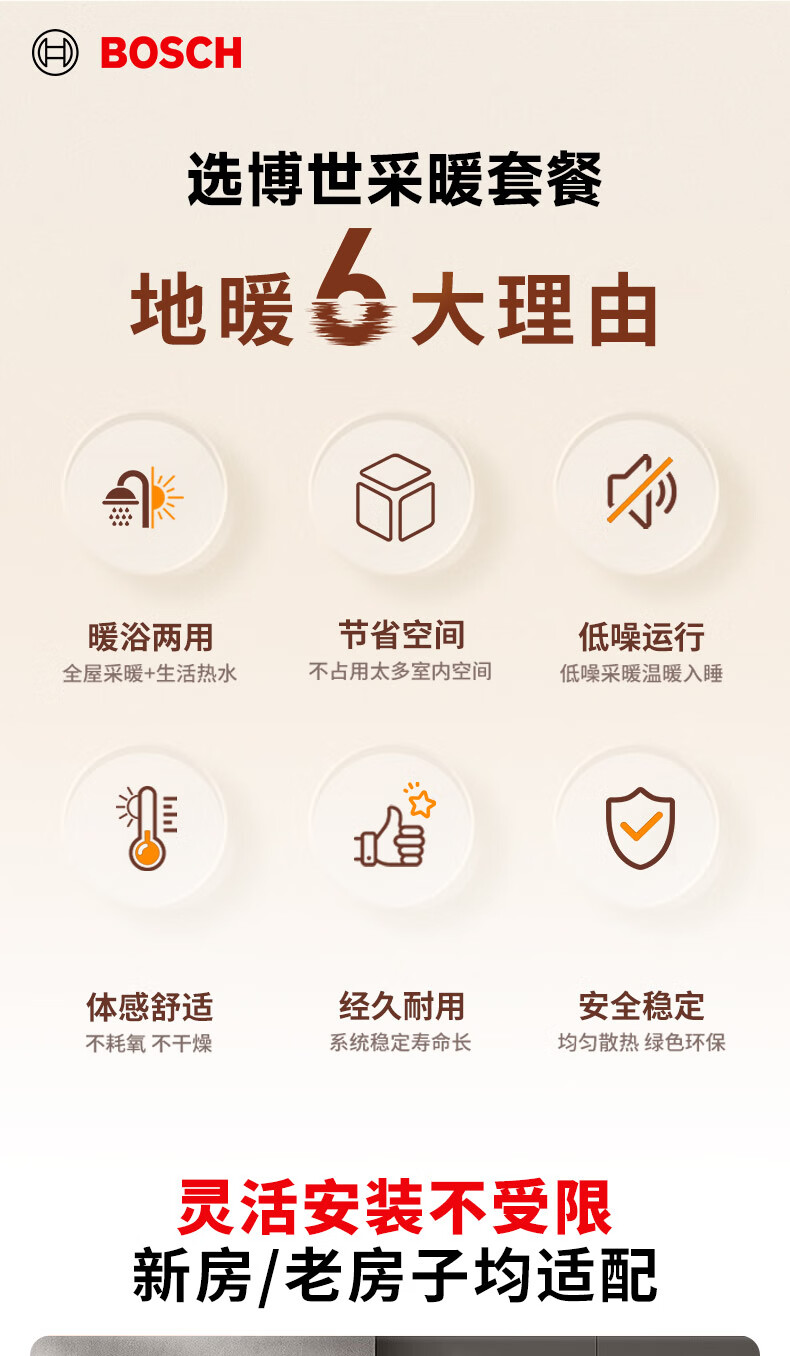 • 商品名称:博世壁挂炉弗朗明戈地暖家用天然气采暖水暖壁挂式全套供暖系统G5100-24KW+实铺75-90平方地暖铺设 L1P27-G5100WE 24 CG/套