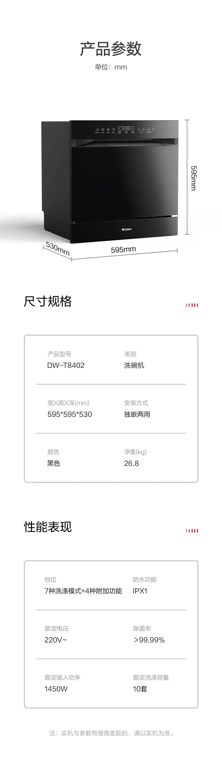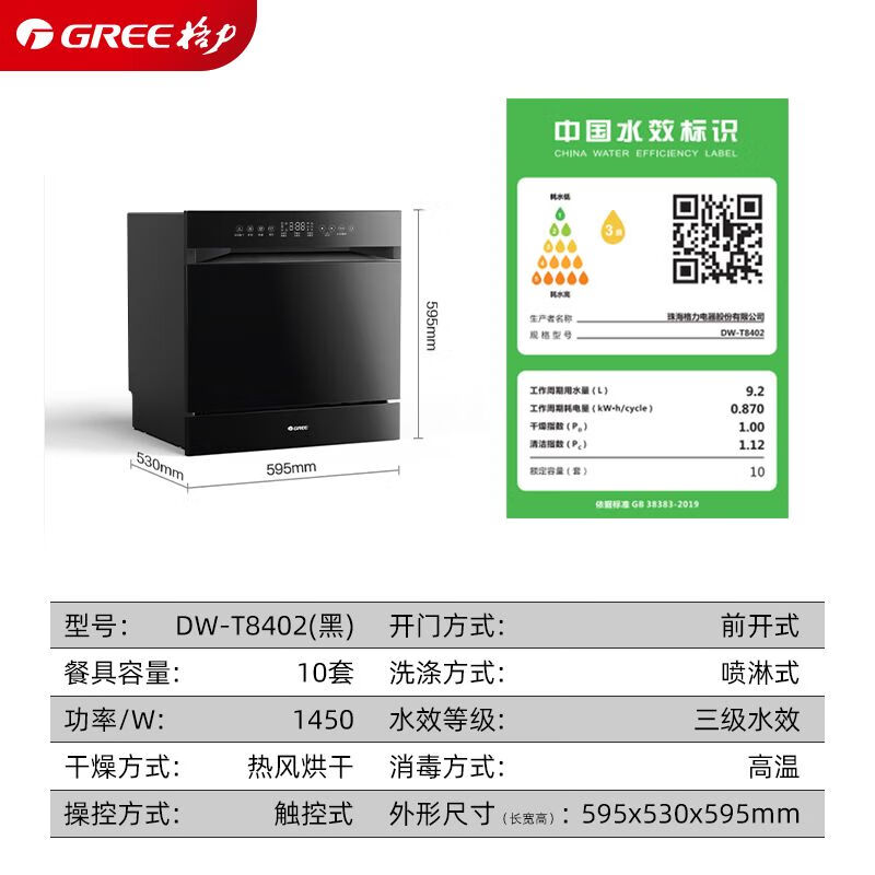 • 商品名称:格力(GREE)10套大容量独立式嵌入式两用家用自动除菌节能热风烘干智能洗碗机 DW-T8402(黑) DW-T8402/套