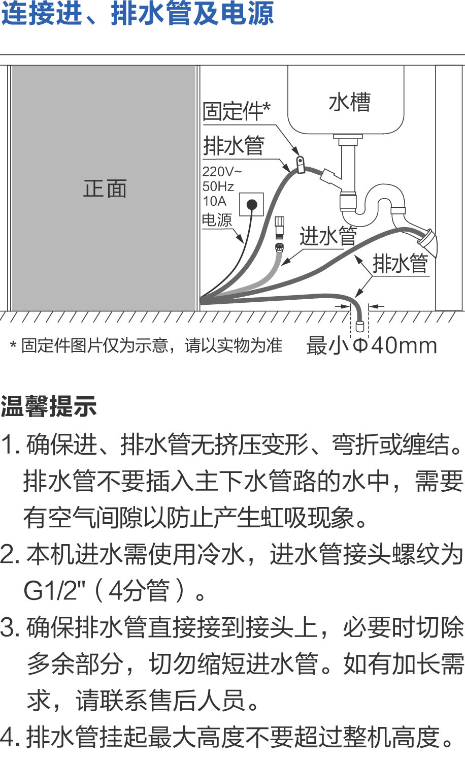 包装清单: 说明书*1 加盐漏斗*1 使用需知贴*1 防水贴*1 螺钉*4 洗碗剂试用装*1 进水管*1