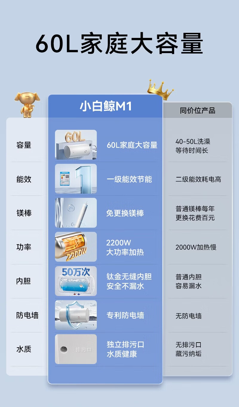 商品名称: 京东京造60升电热水器 钛金加厚无缝胆 一级能效 免换镁棒 2200W大水量专利防电墙JZ-KB60M01 JZ-KB60M01/台