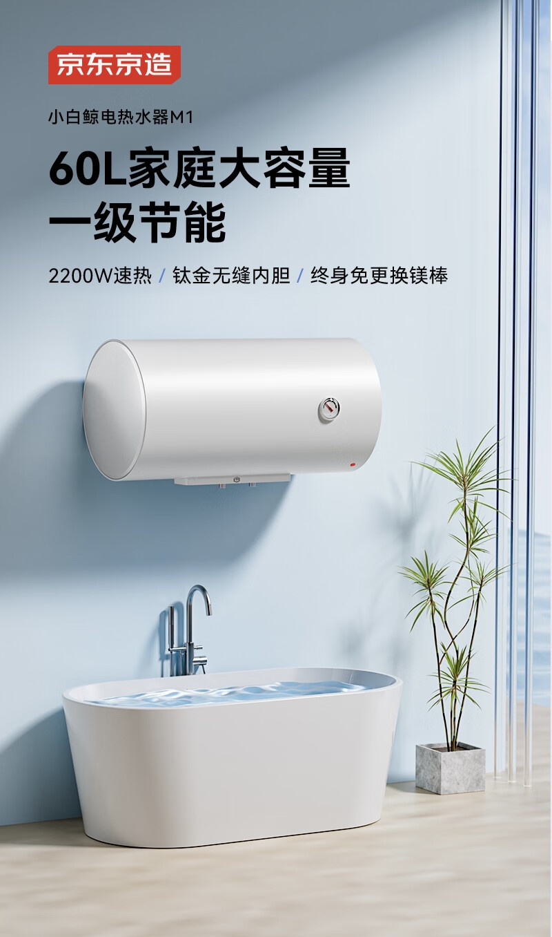 家用电器  > 厨卫大电  > 电热水器  >  京东京造  >  京东京造60升电热水器 钛金加厚无缝胆 一级能效 免换镁棒 2200W大水量专利防电墙JZ-KB60M01 JZ-KB60M01/台