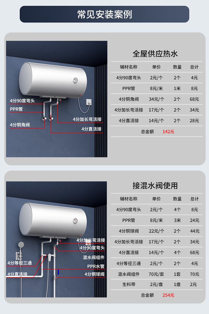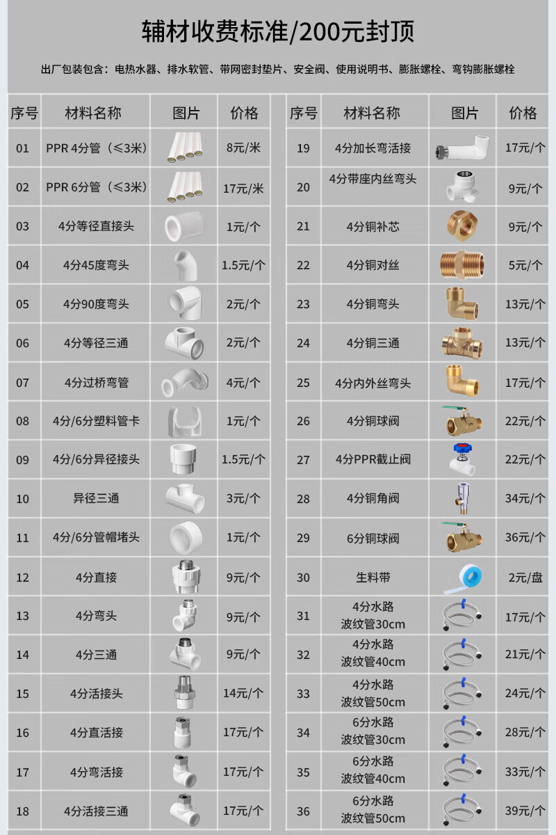 包装清单: 电热水器*1台 排水软管*1根 带网密封垫片*1个 安全阀*1只 使用说明书*1份 膨胀螺栓*1只 弯钩膨胀螺栓*2只