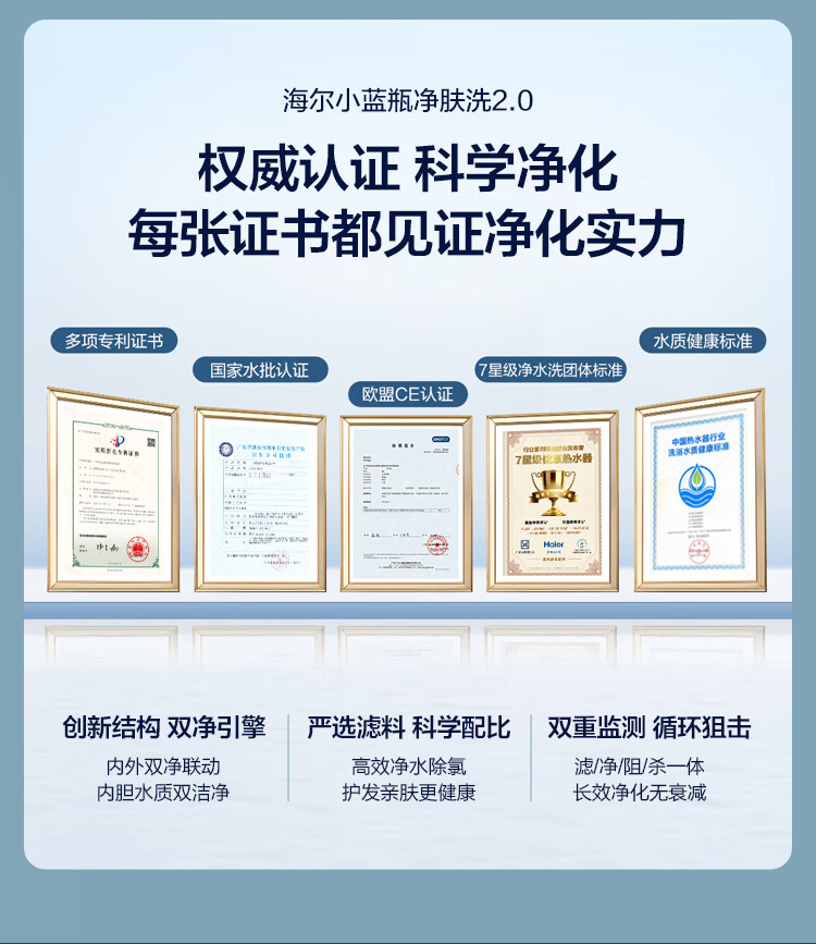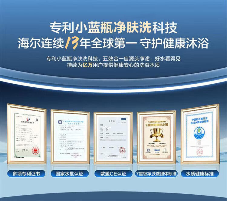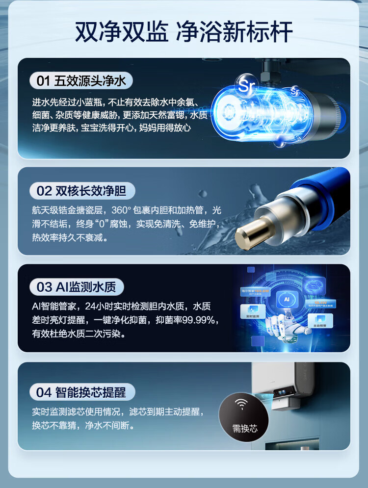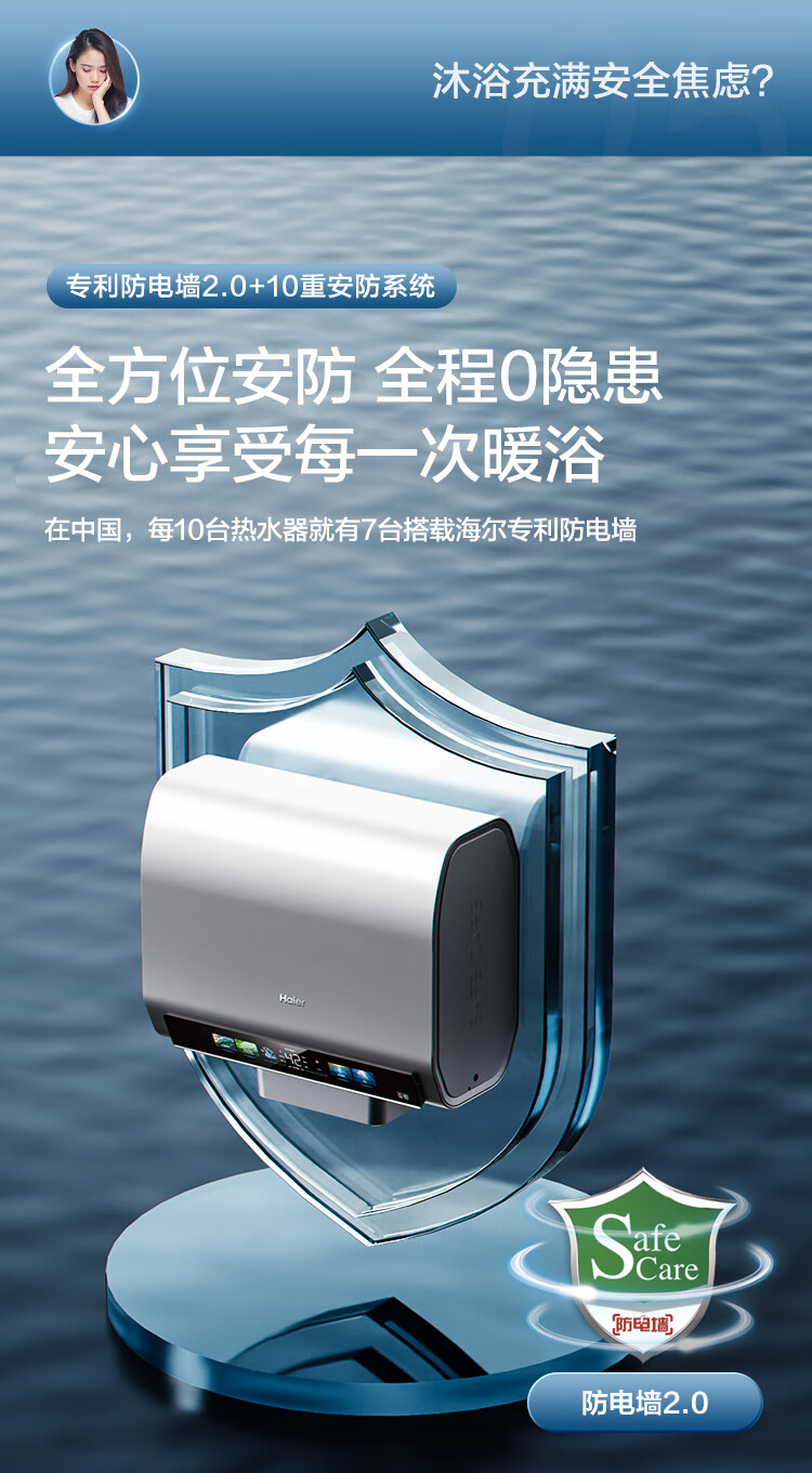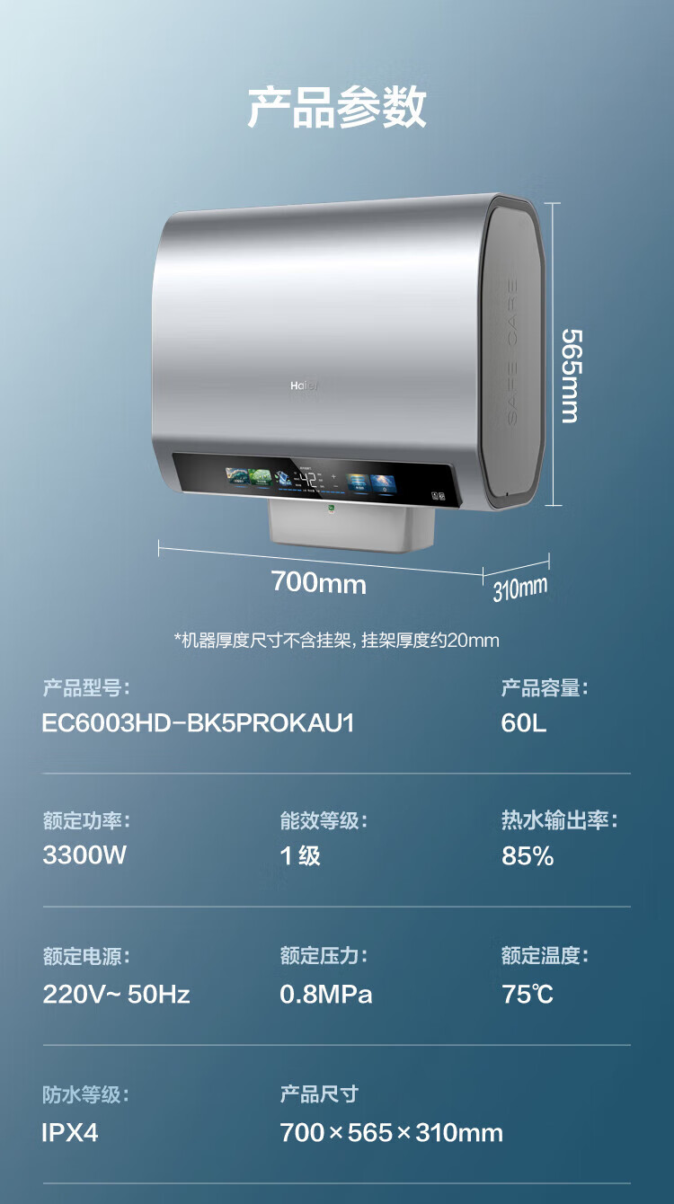• 商品名称:海尔(Haier)双胆扁桶电热水器60升麦浪BK5PRO 富锶小蓝瓶净肤洗 免清洗 双3300W速热节能一级能效 EC6003HD-BK5PROKAU1/台