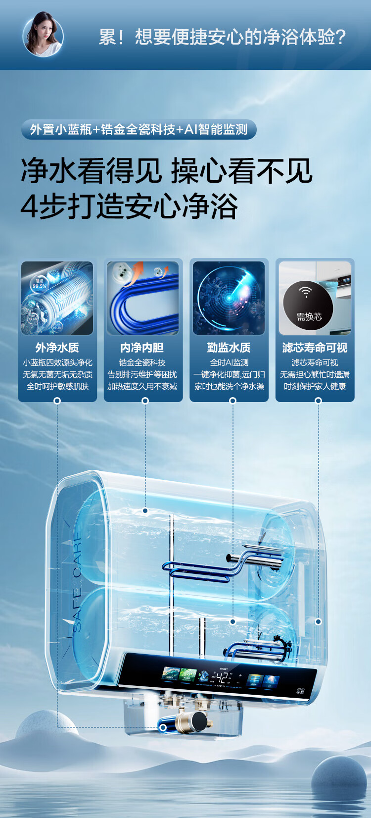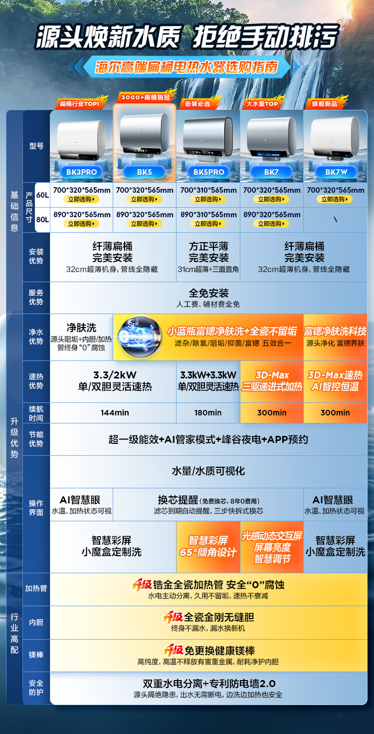 家用电器  > 厨卫大电  > 电热水器  >  海尔/Haier  >  海尔(Haier)双胆扁桶电热水器60升麦浪BK5PRO 富锶小蓝瓶净肤洗 免清洗 双3300W速热节能一级能效 EC6003HD-BK5PROKAU1/台