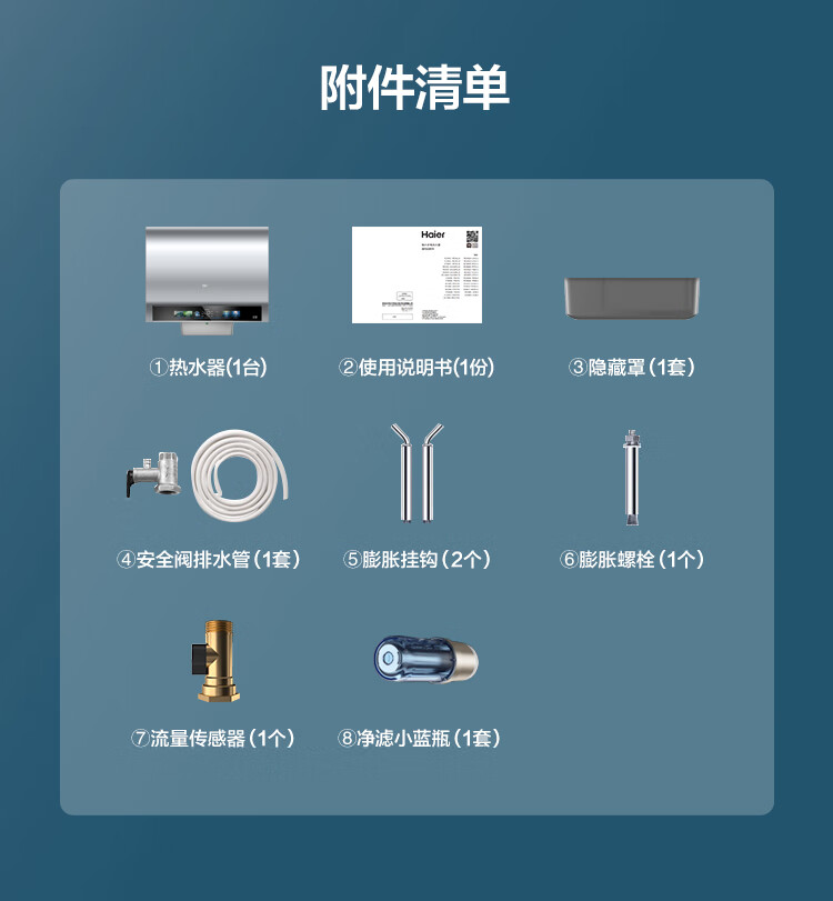 包装清单: 热水器1台、安全阀、排水管1套、膨胀螺栓1个,膨胀挂钩2个,说明书1本,隐藏罩,流量传感器1个