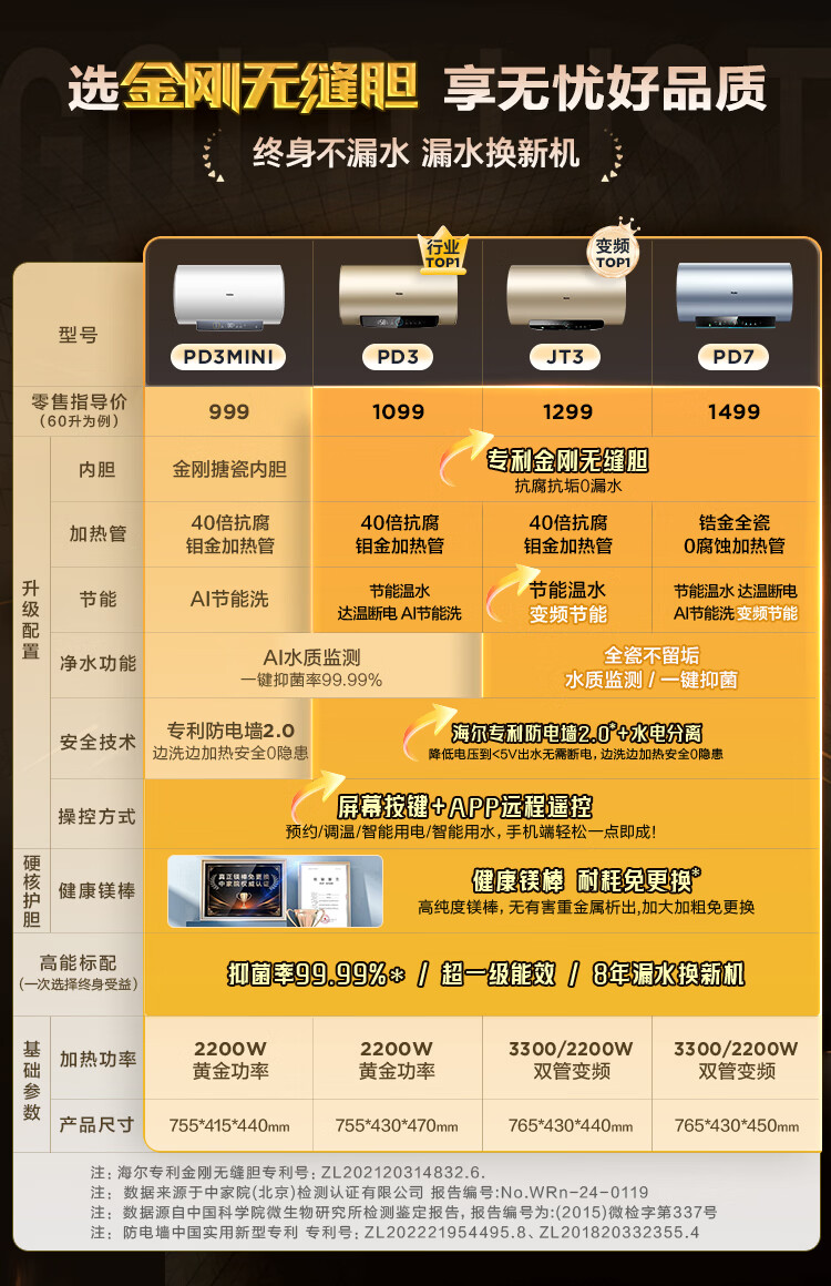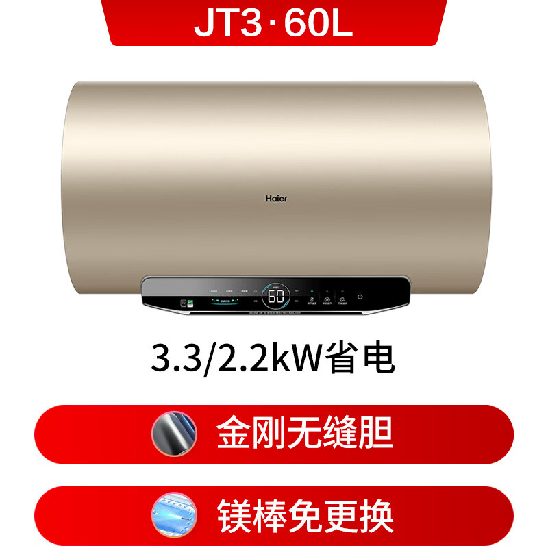 • 商品名称:海尔(Haier)电热水器60升 JT3 金刚无缝胆 3300W变频节能速热 终身免换镁棒 一级能效家用储水式 EC6002-JT3U1/台