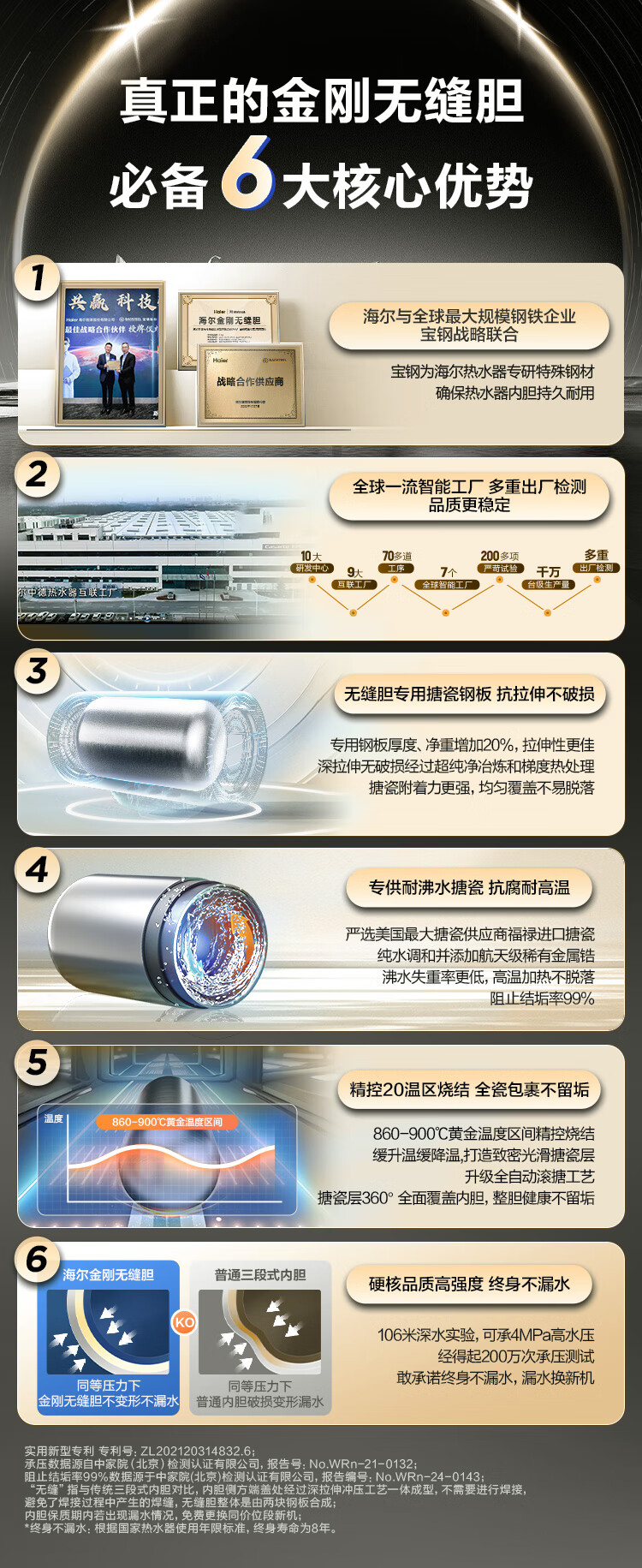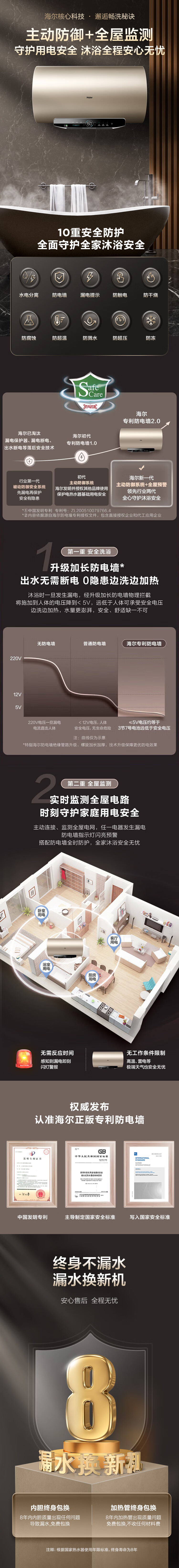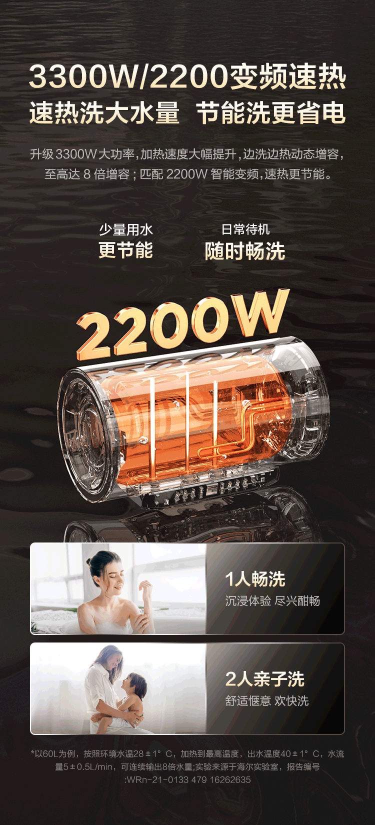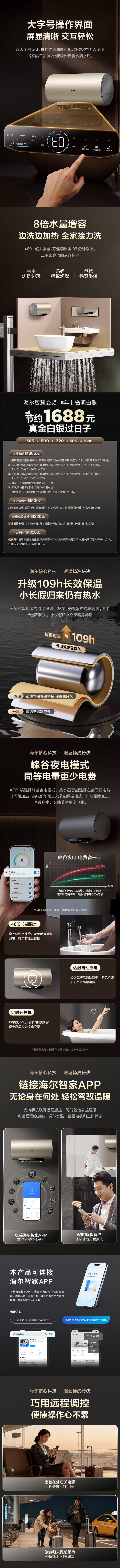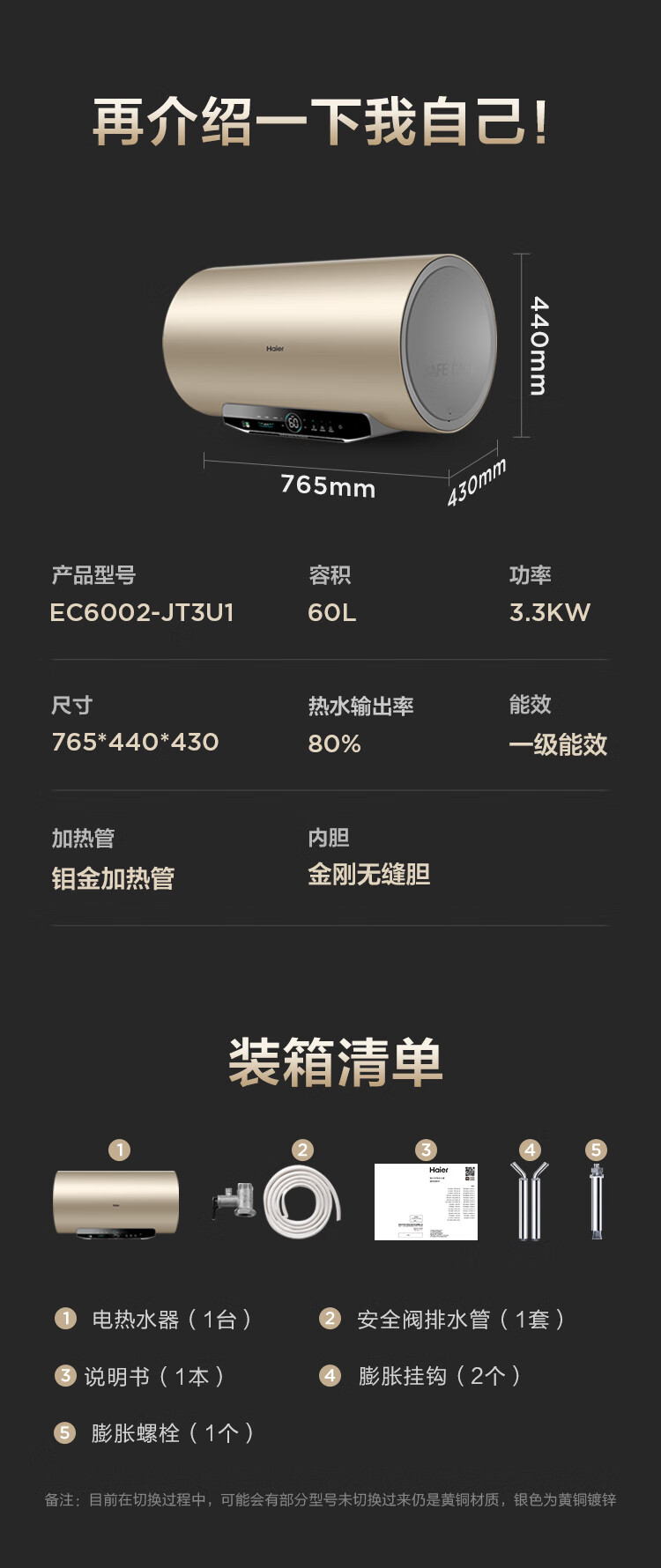家用电器  > 厨卫大电  > 电热水器  >  海尔/Haier  >  海尔(Haier)电热水器60升 JT3 金刚无缝胆 3300W变频节能速热 终身免换镁棒 一级能效家用储水式 EC6002-JT3U1/台