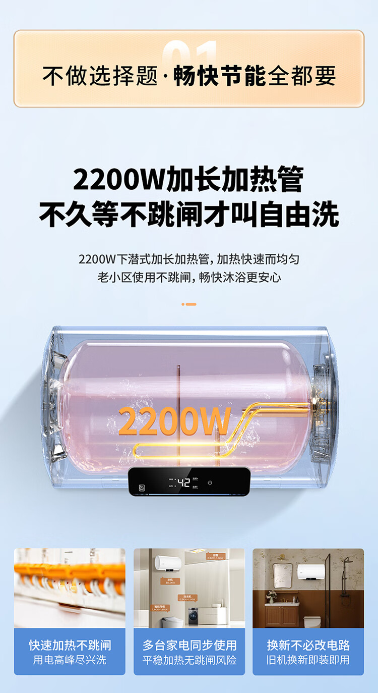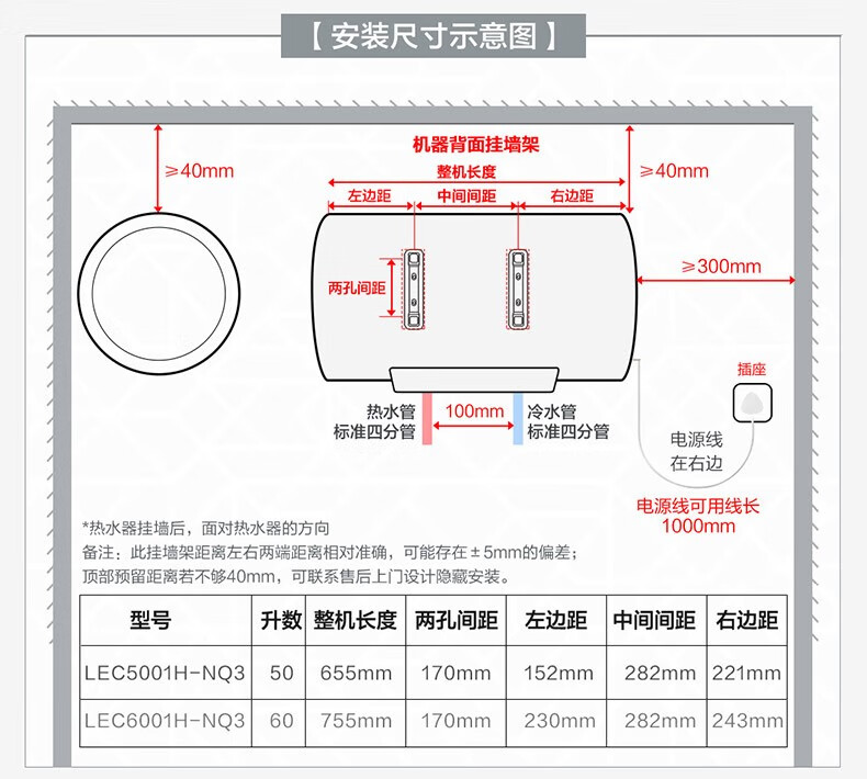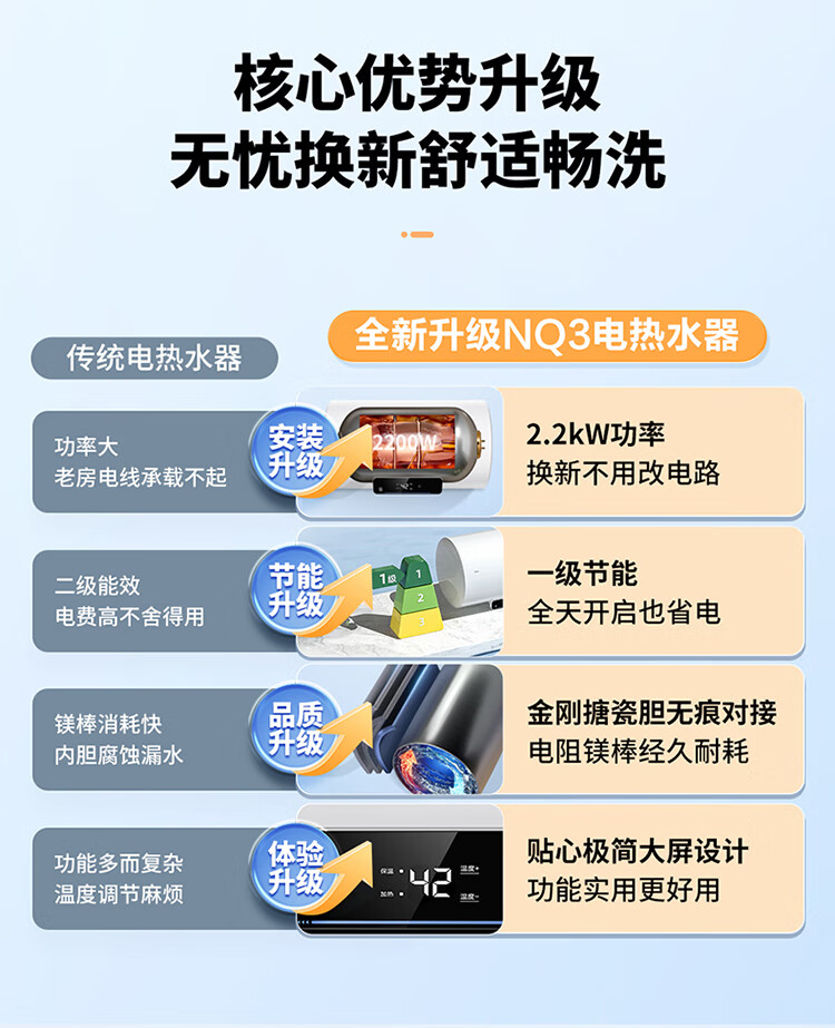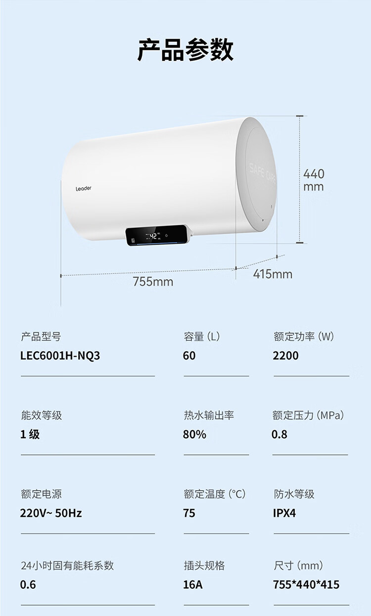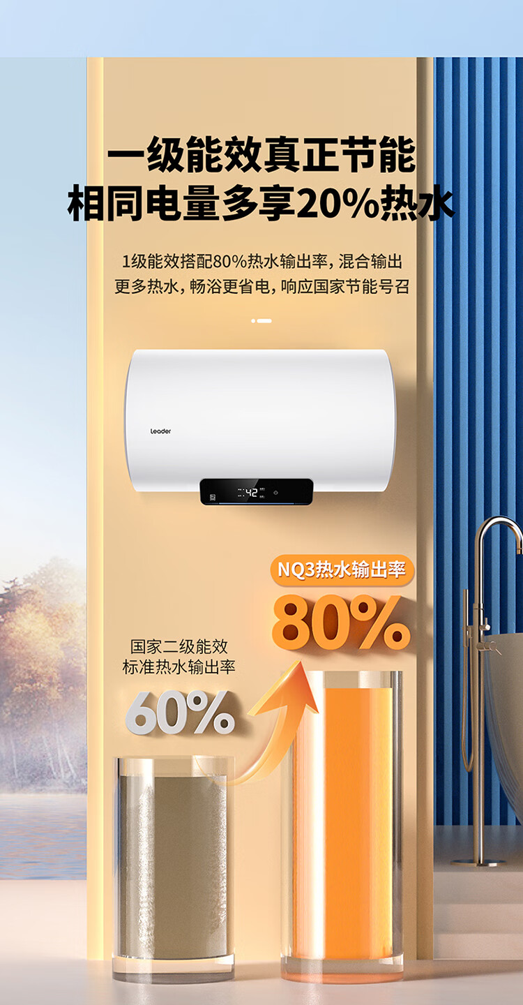 • 商品名称:海尔出品统帅60升电热水器京东自营上门安装2200W速热保温专利防电墙家用储水式LEC6001H-NQ3 LEC6001H-NQ3/台