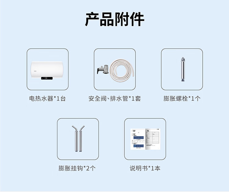 包装清单: 电热水器1台、安全阀排水管1套、膨胀螺栓1个、膨胀挂钩2个、说明书1本