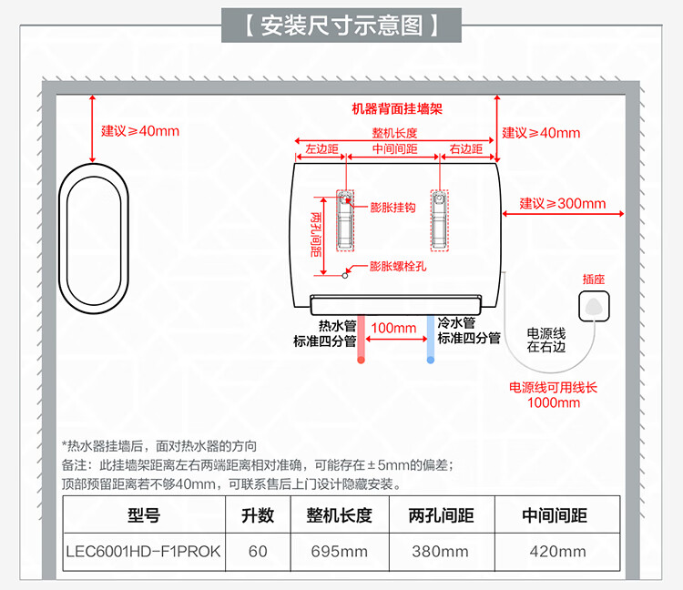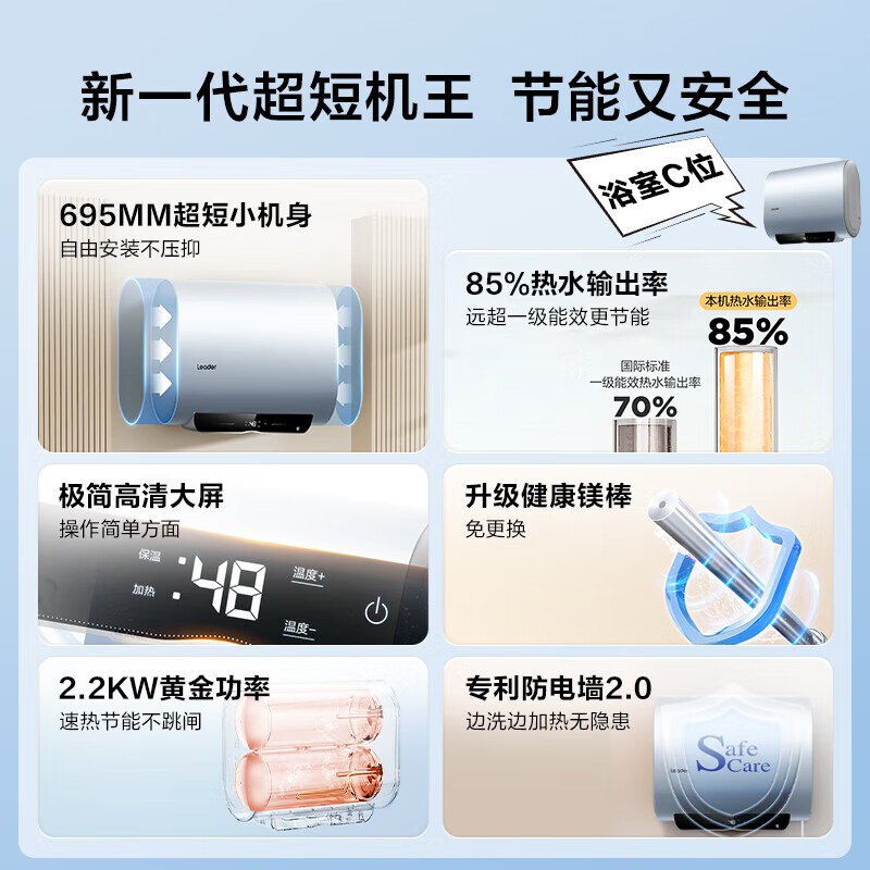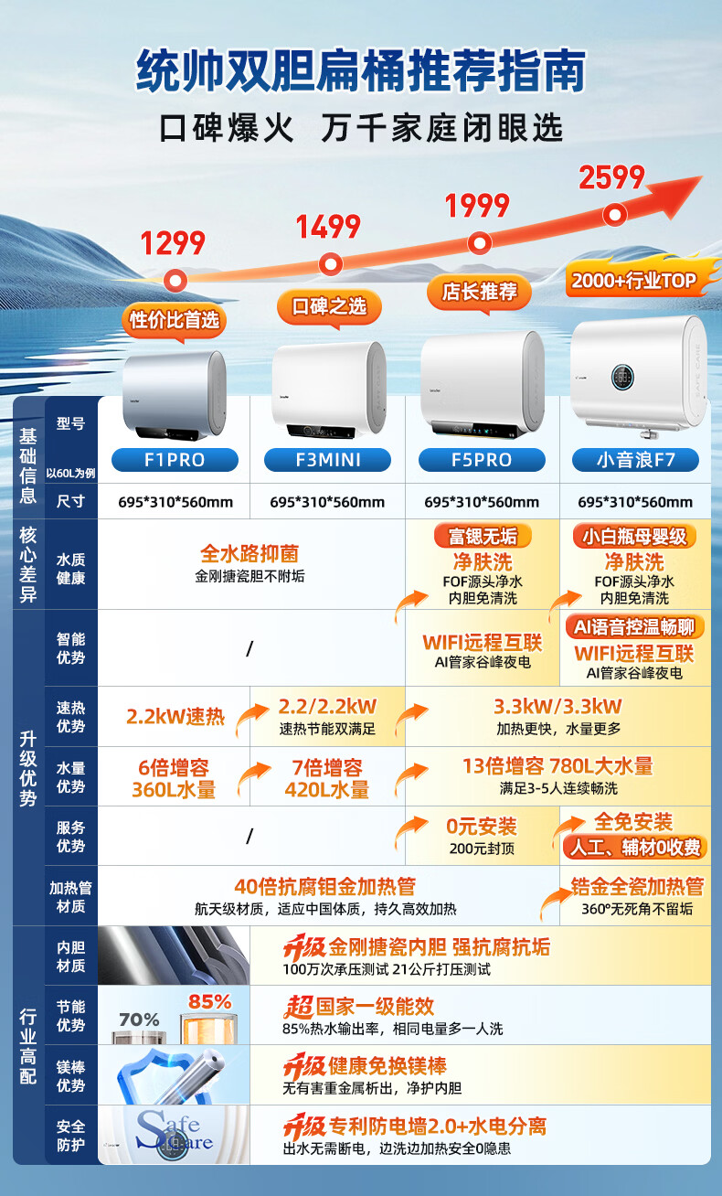 • 商品名称:海尔出品统帅 60升扁桶电热水器京东自营上门安装2200W节能速热一级能效家用储水式F1PROK LEC6001HD-F1PROK/台