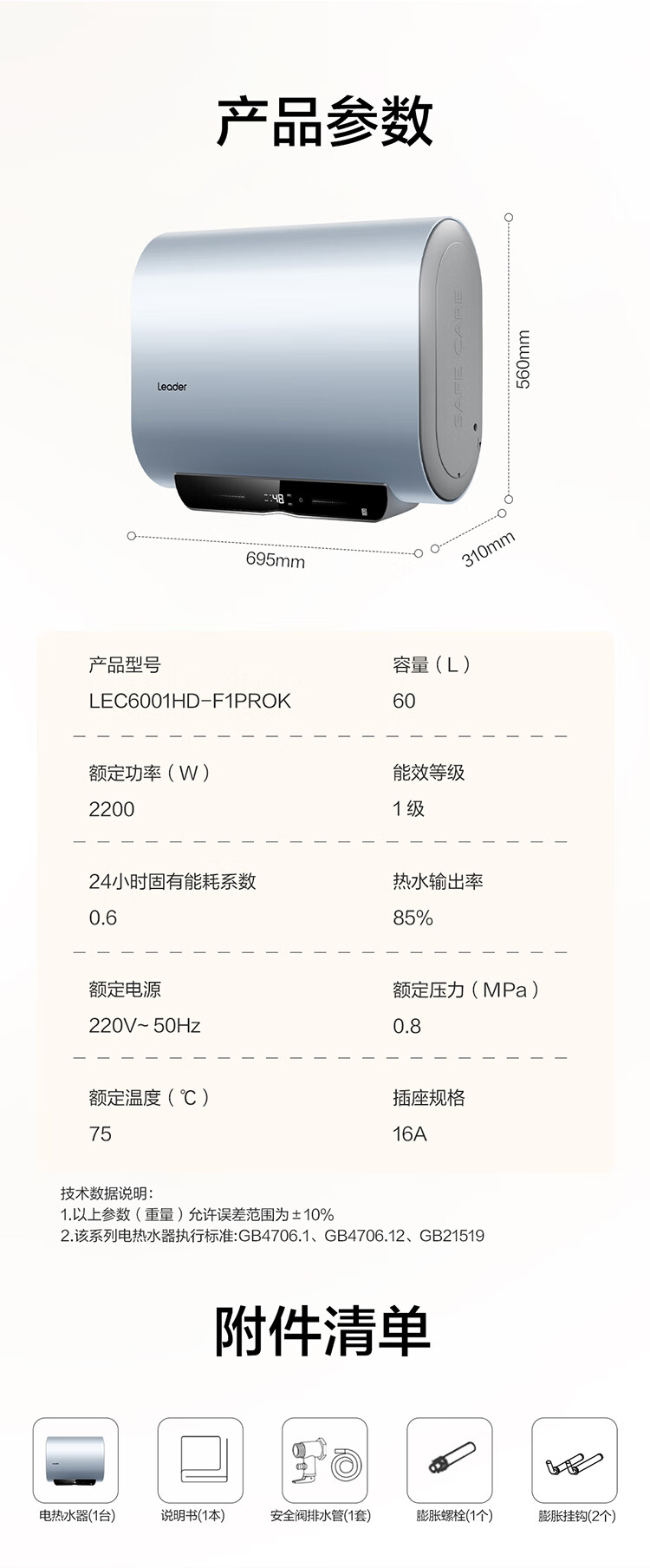包装清单: 电热水器1台、安全阀排水管1套、膨胀螺栓1个、膨胀挂钩2个、说明书1本