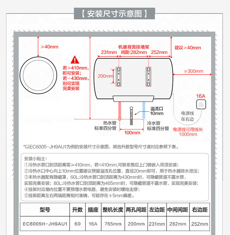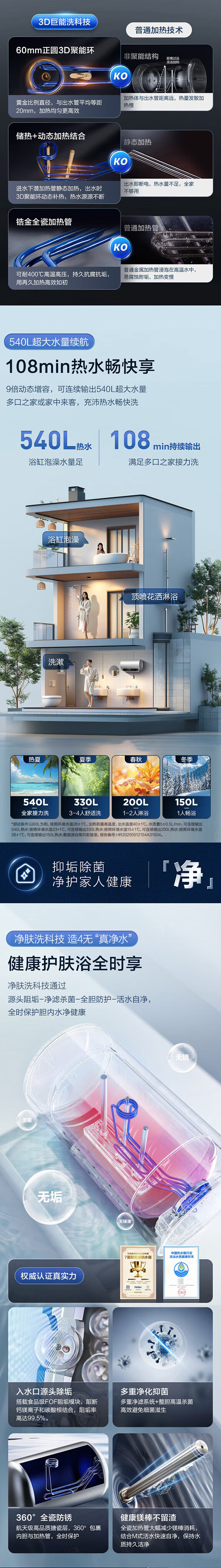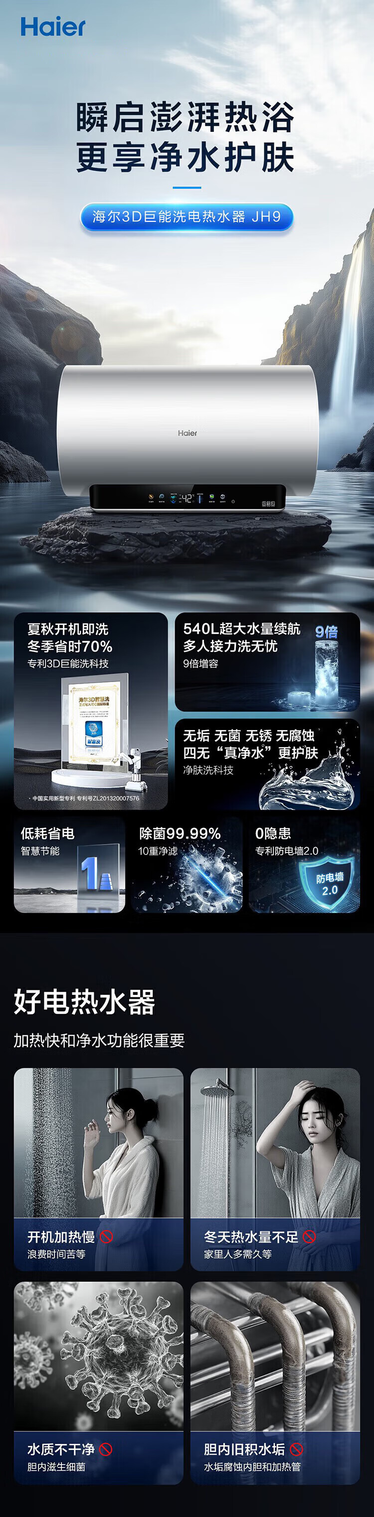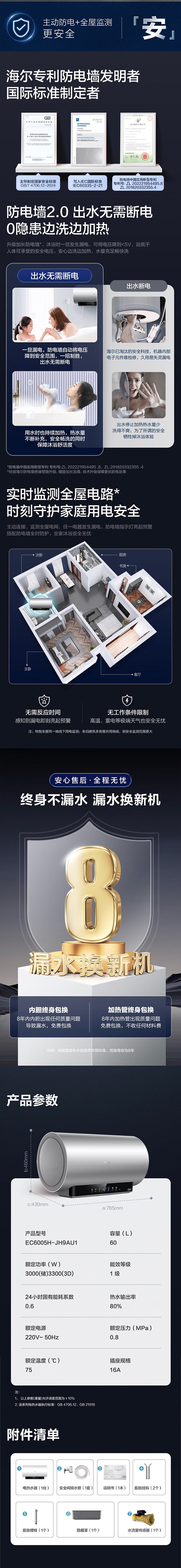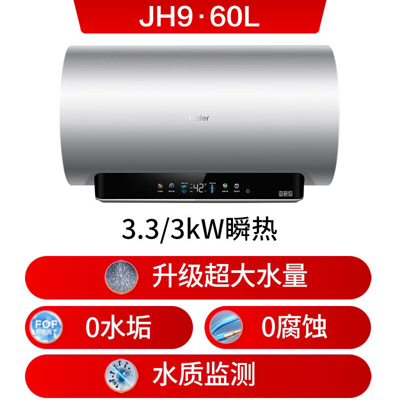 • 商品名称:海尔(Haier)电热水器60升 小红花JH9 无垢鲜活水净肤洗 JH7升级款 3D巨能洗 3300W瞬热家用储水式 EC6005H-JH9AU1/台